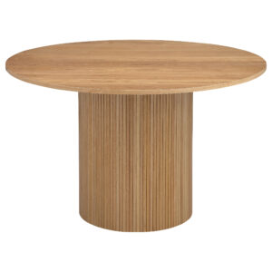 $889.00Revamp your space with the Bradbury light brown round dining table. Its sleek design, fluted base, and wood grain details create a warm, inviting atmosphere. -