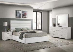 $2,643.00Felicity Collection: A modern platform bed with white faux leather and sleek high-gloss case pieces featuring chrome accents. -