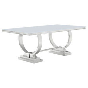 $1,214.00This modern Antoine dining table features a tempered glass top, sculptural chrome-finished base, and stainless steel construction for a sophisticated look. -