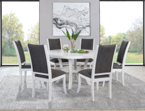$1,524.00Embrace modern minimalism with the Judd dining set: a roomy round table for 4-6, flared legs, dark grey upholstered chairs, and a fresh pearl white finish. -