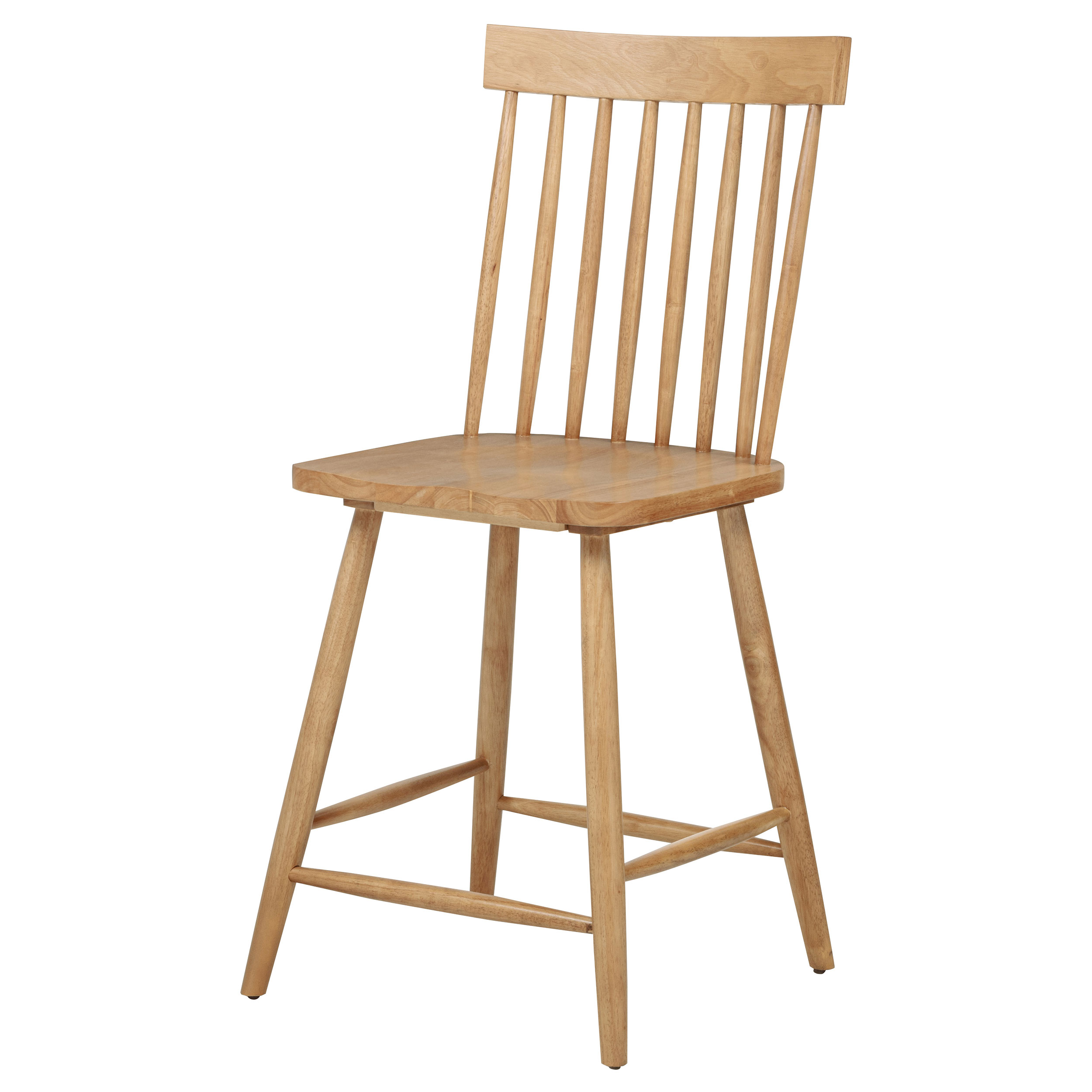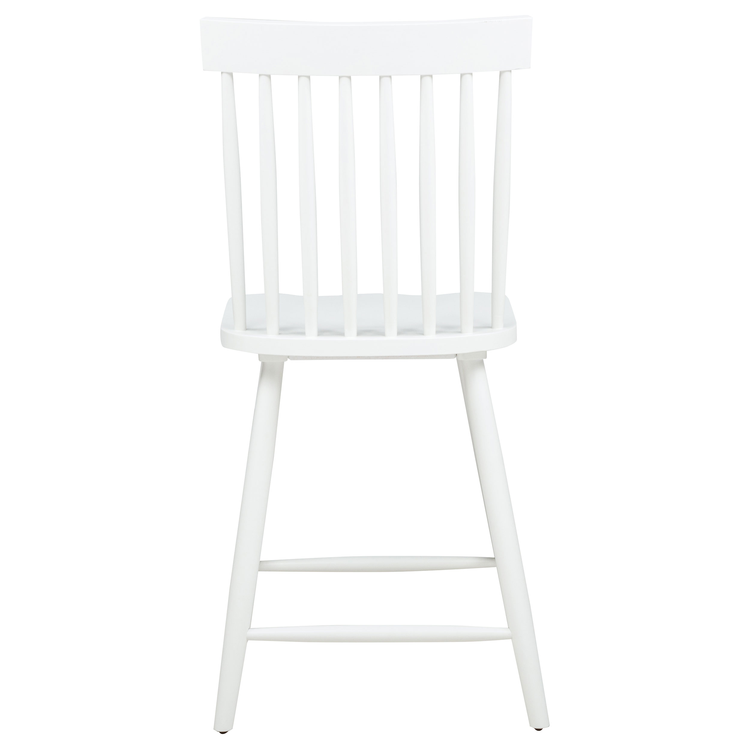 Classic and casual with a fresh farmhouse flair, this Windsor-style counter height chair features a high spindle back and gently contoured seat for timeless comfort. The clean silhouette is crafted from solid rubberwood with a rich wood veneer that enhances its natural grain. Angled legs with double stretchers offer reliable support and charm. Ideal for kitchen islands, pub tables, or counter-height dining spaces.