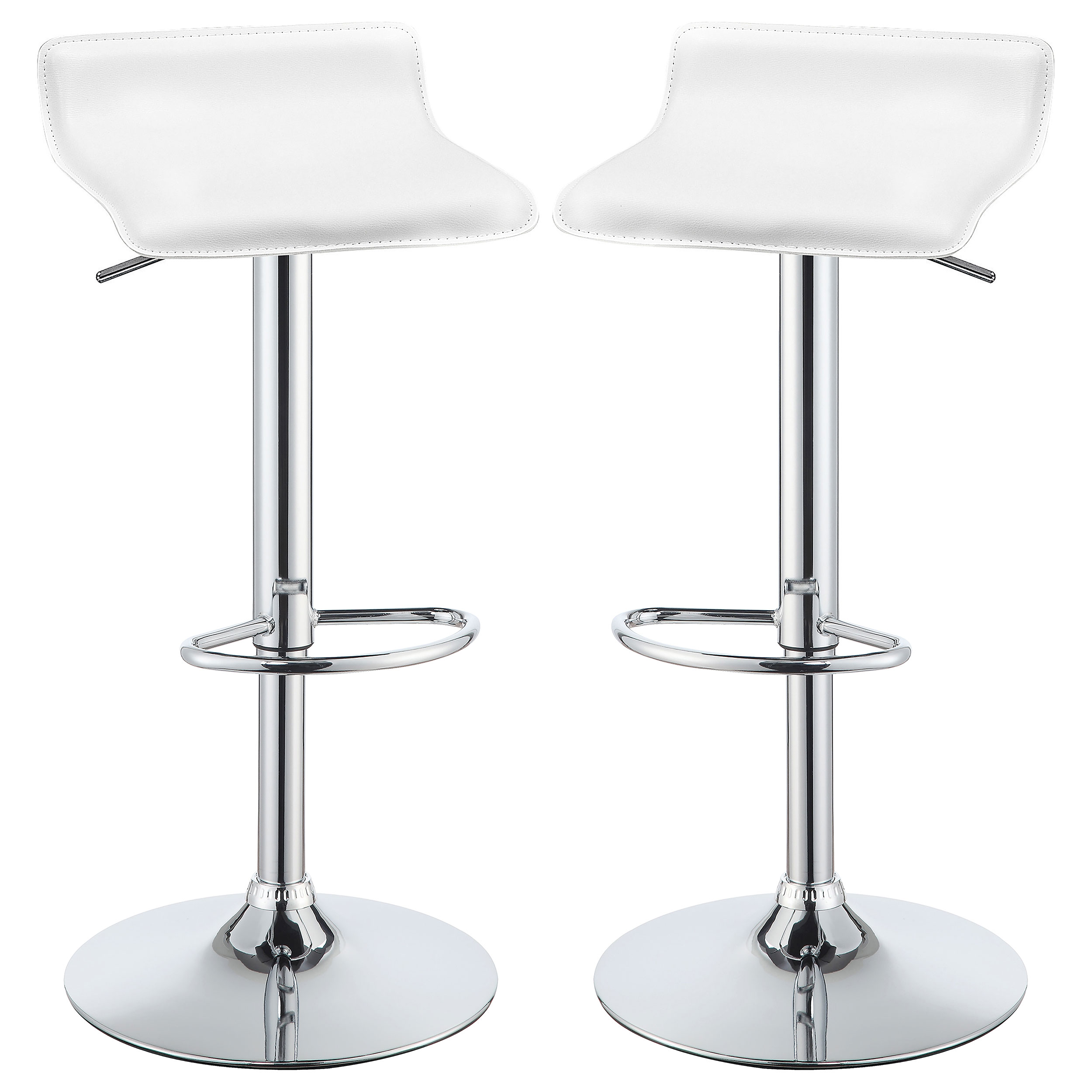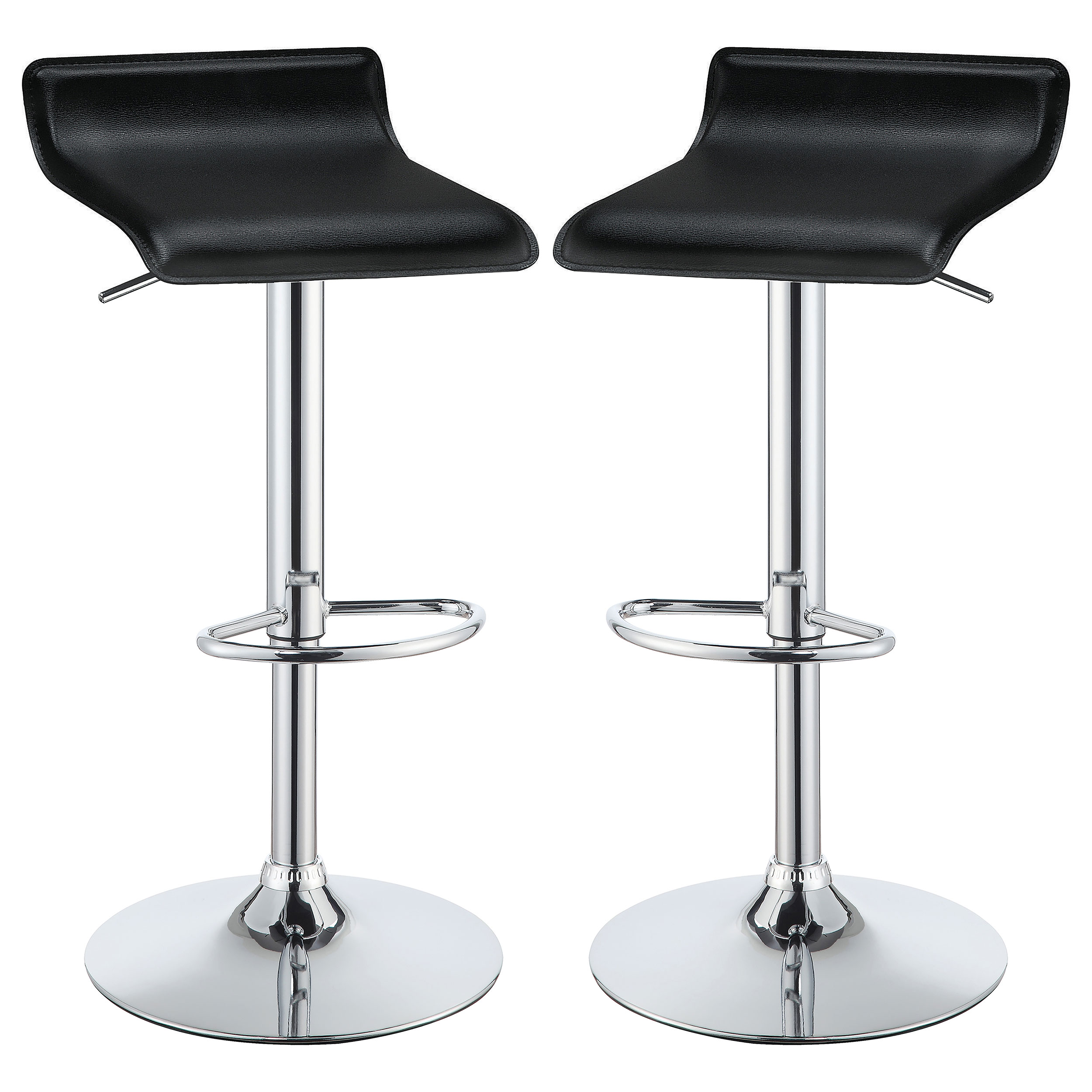 An adjustable barstool with a modern silhouette is a beautiful upgrade to any kitchen or lounge space. Featuring black upholstery, the stool features a curved seat that offers just the barest hint of a back. The seat is height adjustable to accommodate a range of table and counter heights. A chrome finish lends gleaming appeal to a pedestal base. A built-in footrest provides a final touch of comfort and support.