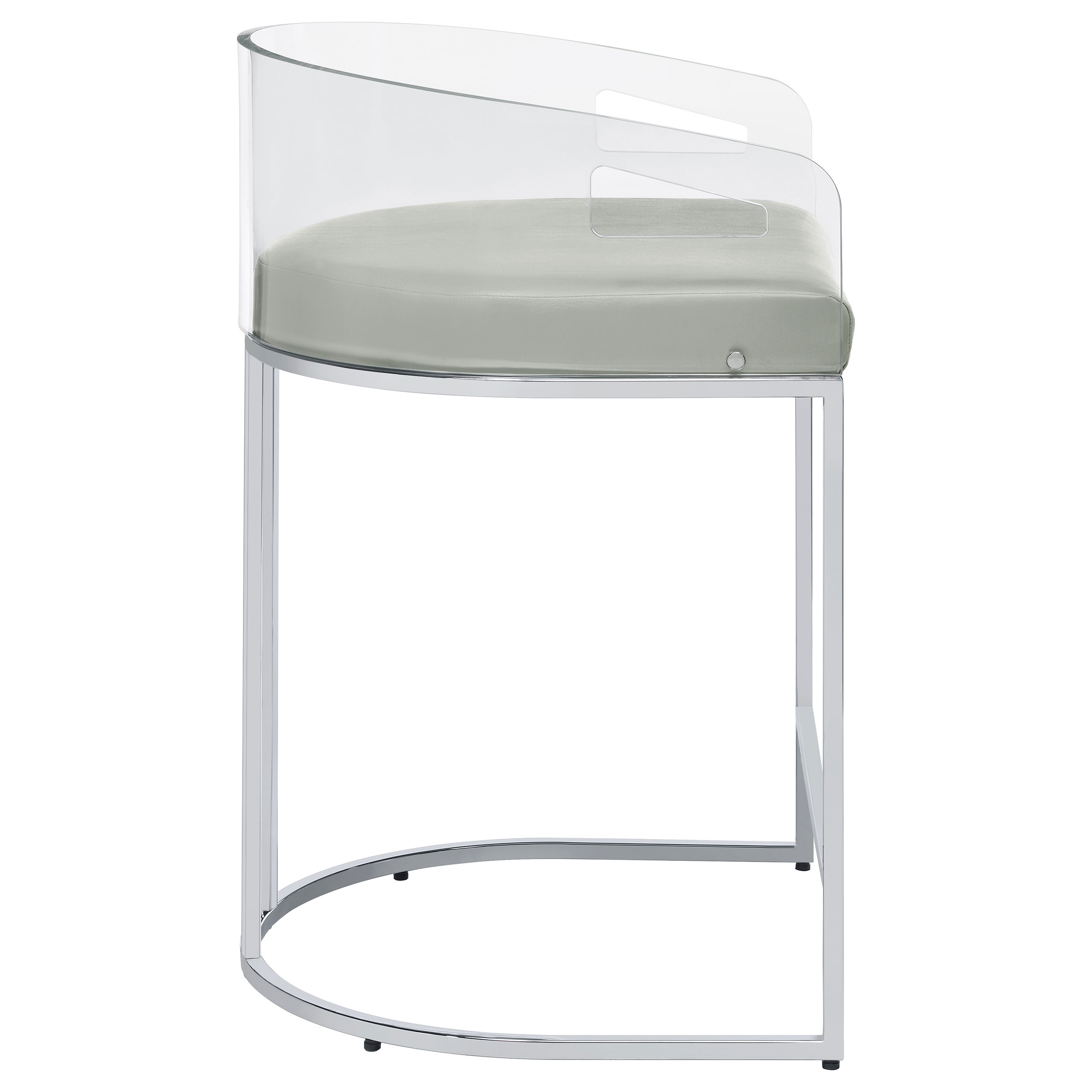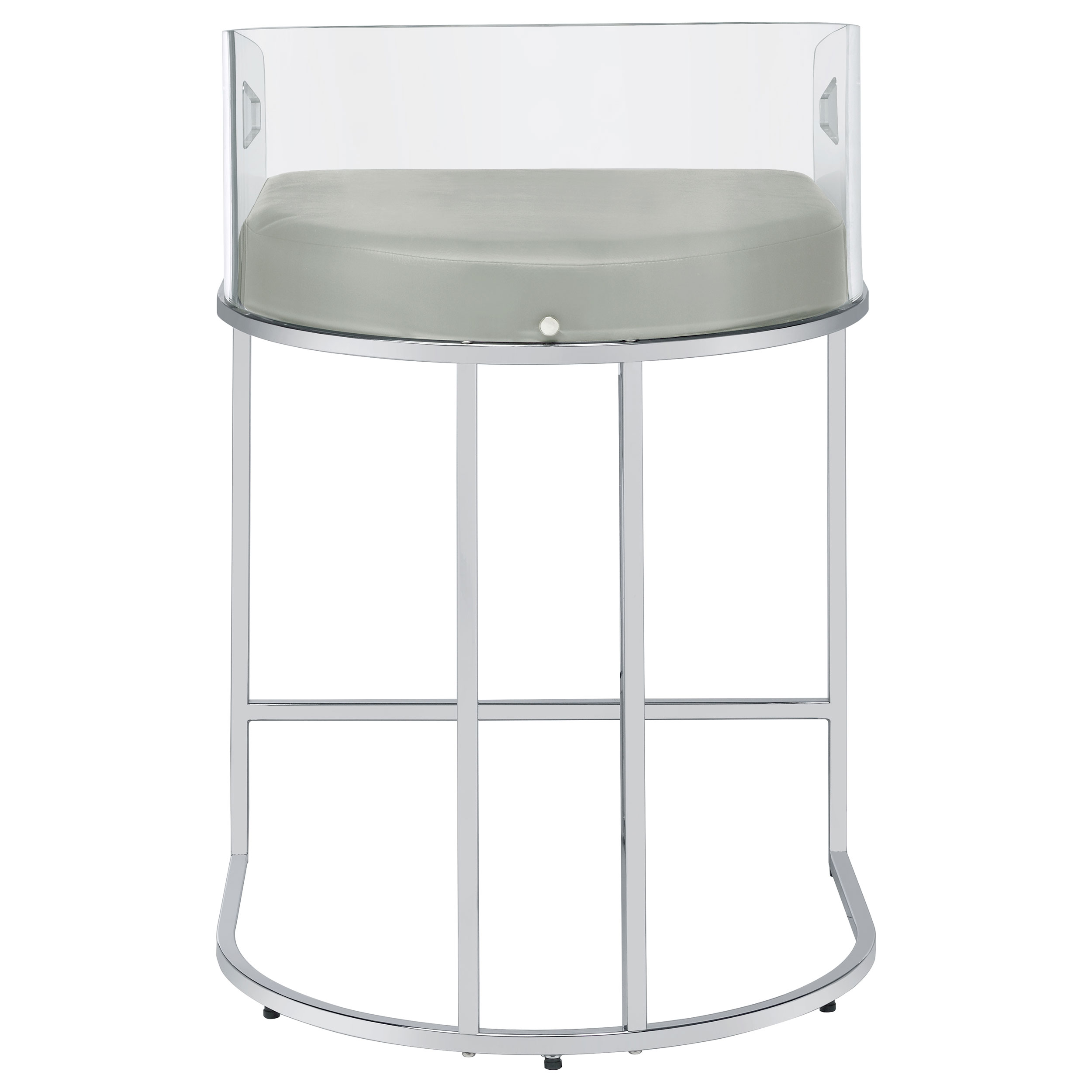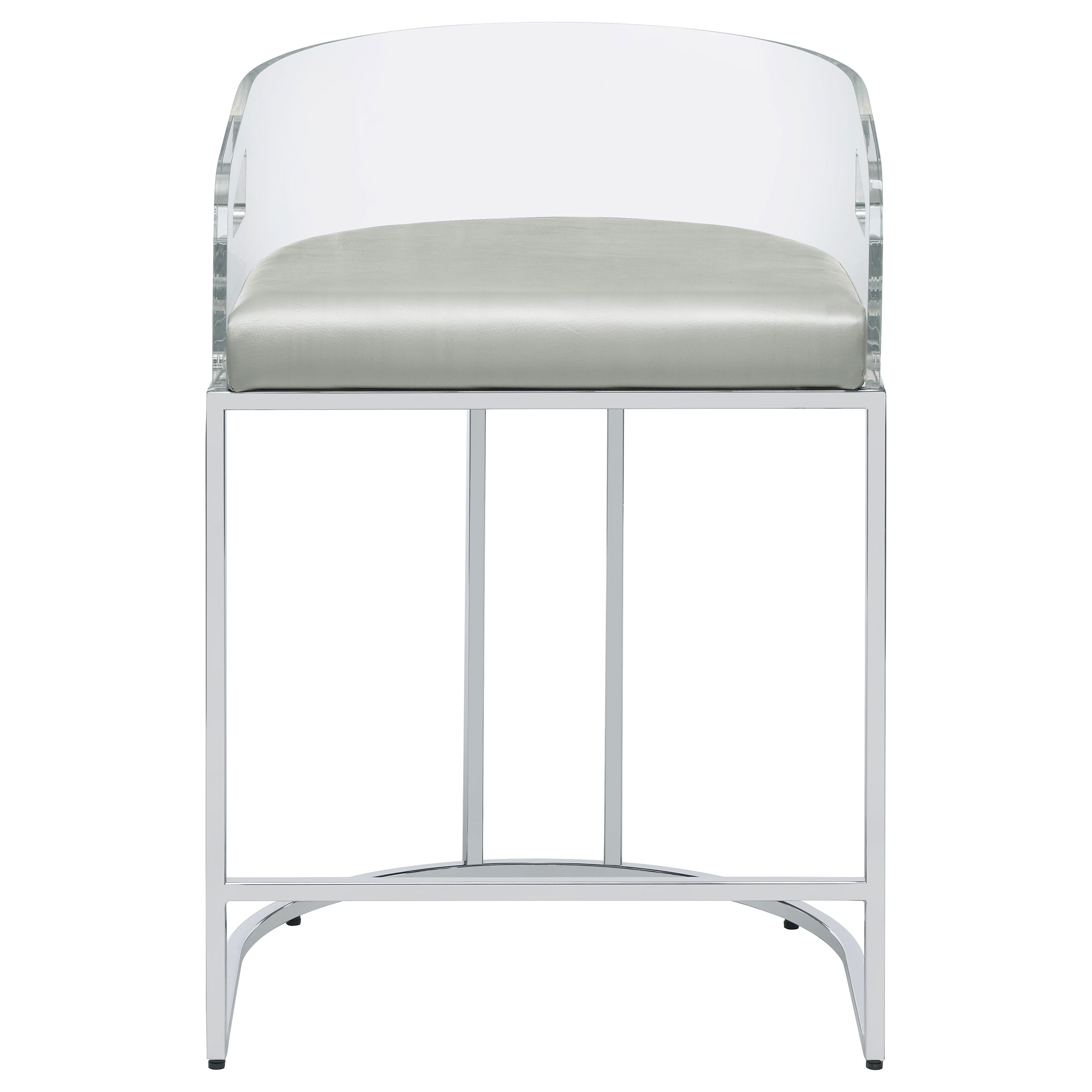 - Ultra-modern with a retro-inspired vibe, these stools feature a curved backrest in a clear acrylic material, leatherette cushion, and slim metal legs in a lustrous chrome finish