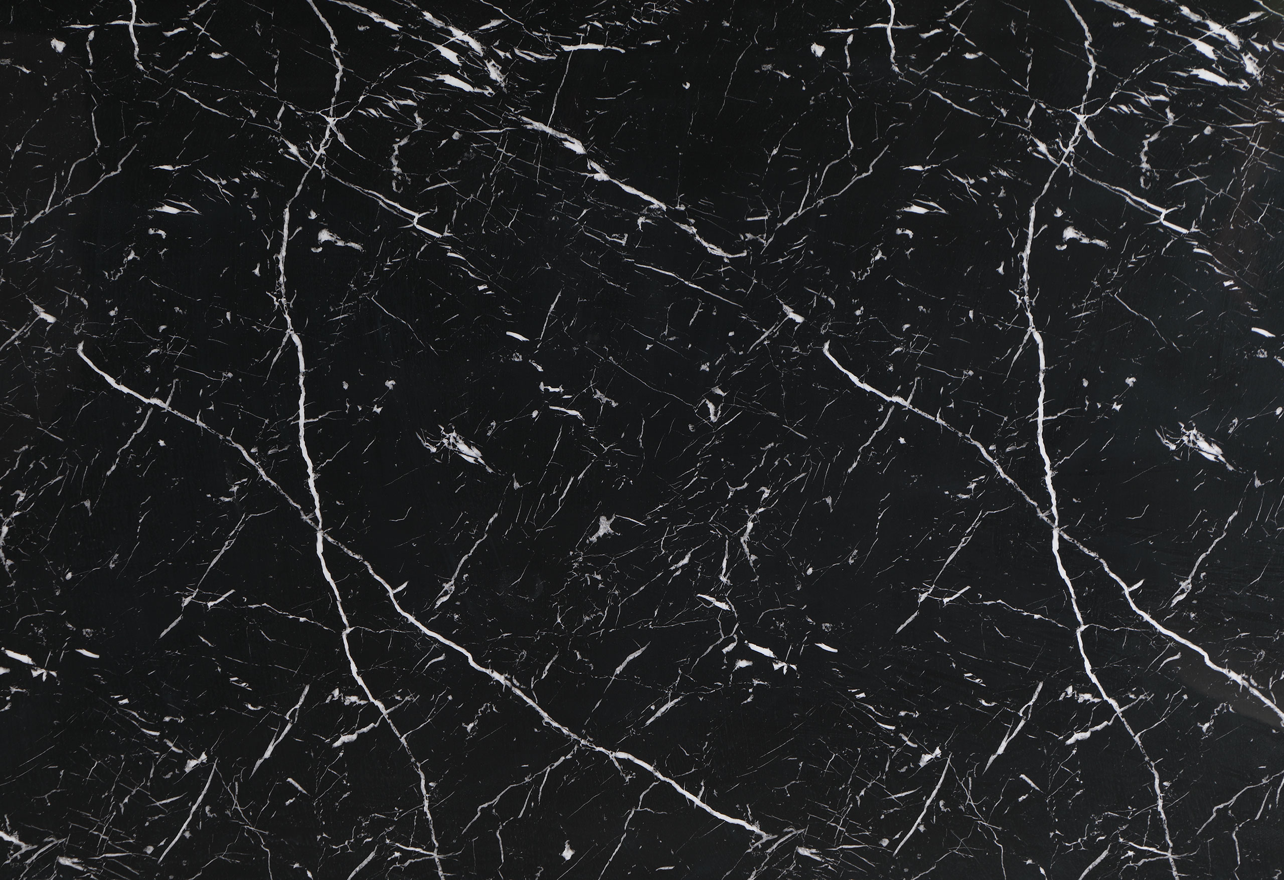 Black Faux marble counter table design with an extra thick top and a double pedestal base with silver connectors.