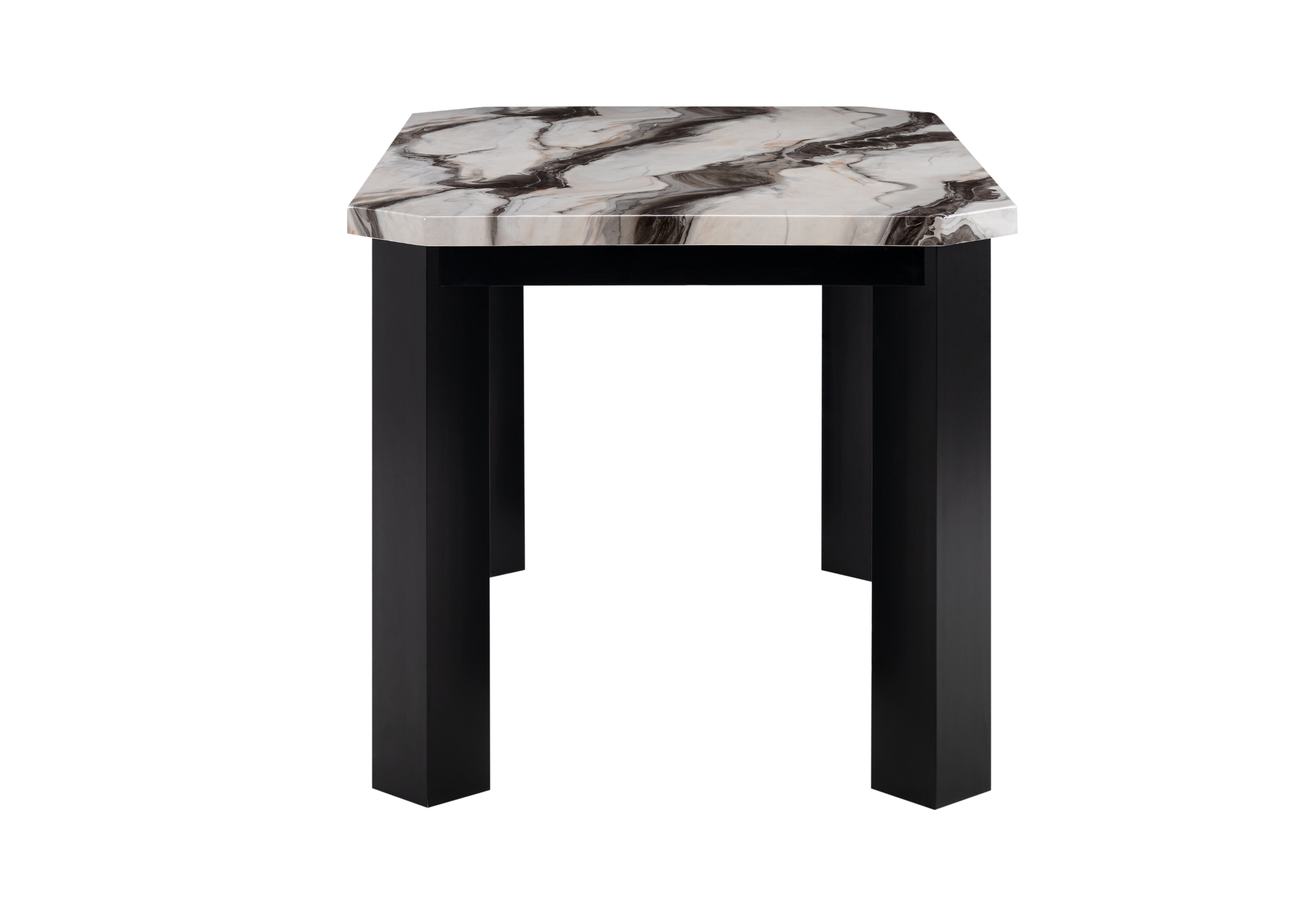Indulge in contemporary luxury with the D06 Bar Table, a statement piece that effortlessly anchors your space in style. The table top is adorned with a stunning faux panda marble paper finish that mimics the exquisite patterns of natural marble, adding opulence without the hefty price tag. The clean, straight lines of the black wooden legs create a sturdy frame, ensuring stability and durability while contributing to the minimalist aesthetic. This table is not only a visual delight but also a practical surface for your social and dining needs.