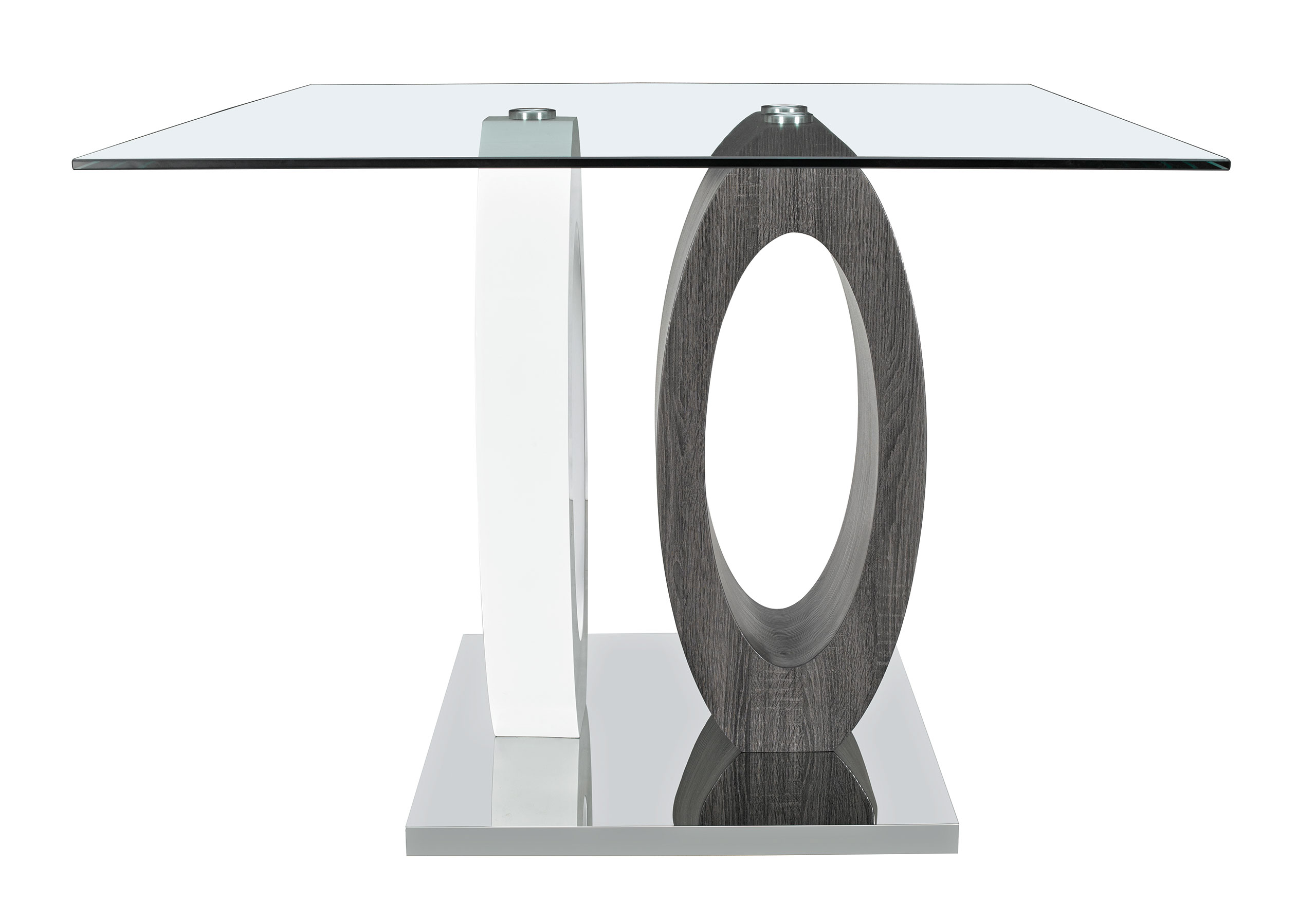 Striking looks and ultra-modern design. This stylish rectangular shaped glass top bar table is finished with a two toned white and wood grain oval pedestal style base and stainless steel support leg giving this table a unique and visually dynamic look. The arrangement of this table makes it a perfect match for your dining area.