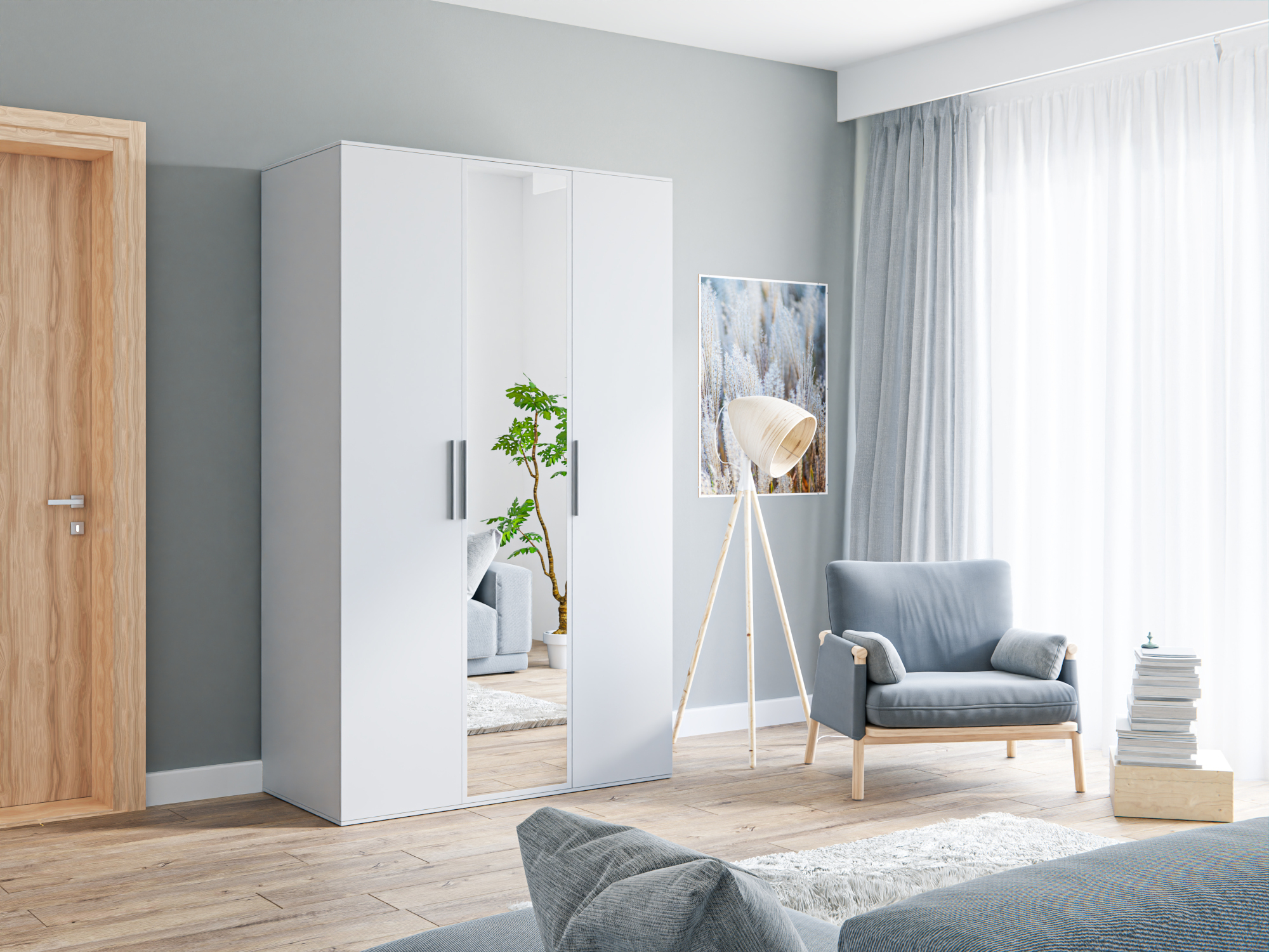 - 3 doors; 6 shelves; one hanging rod; full door mirror