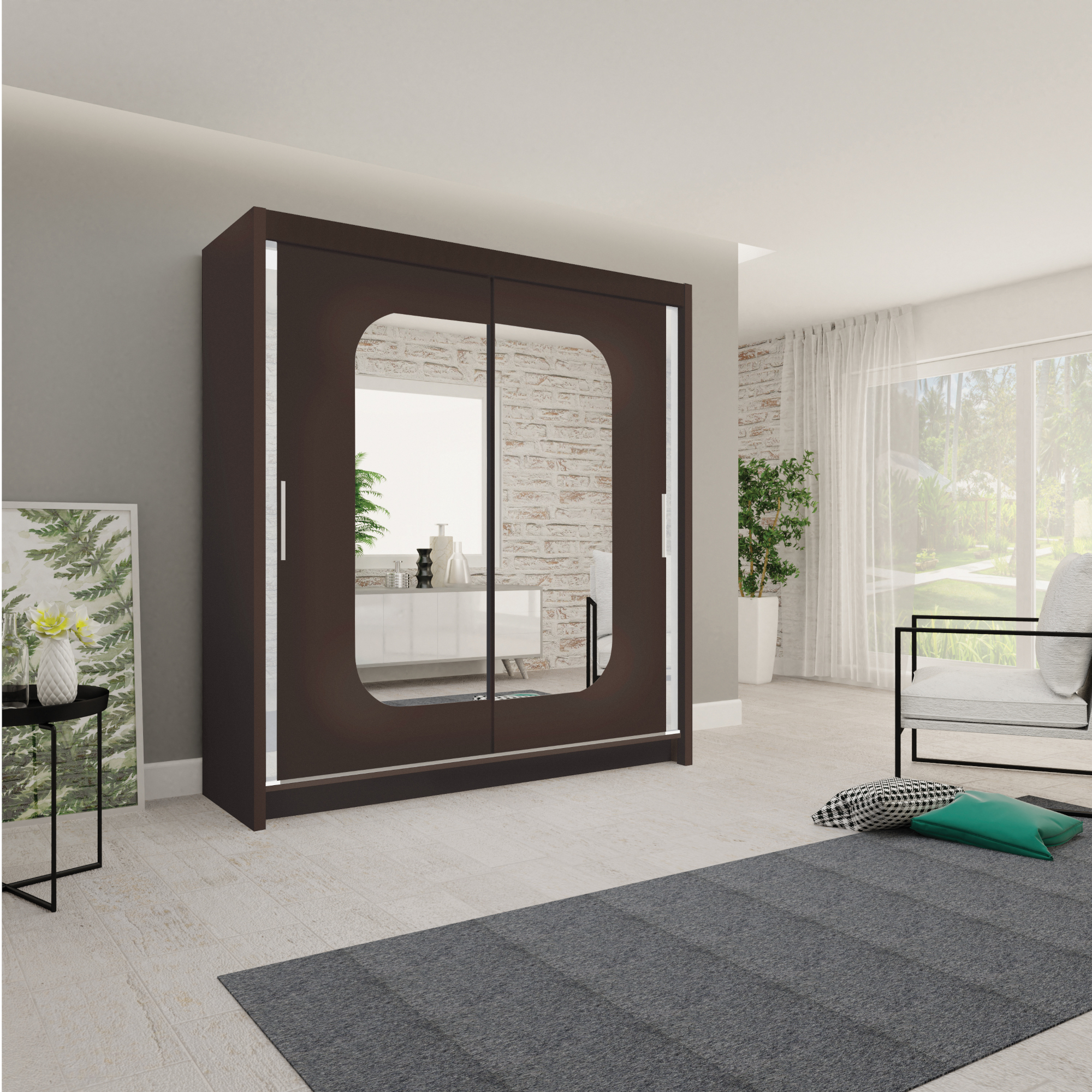 This exquisite wardrobe ensures you have a place to store all of your clothing and more. Rounded mirrors presented on each sliding door are as functional as beautiful. The interior is a customizable shelf design, making certain that no matter your needs this closet can fulfill them. Four shelves, floor and top storage space and two hanging rods make this the perfect solution to your wardrobe needs.