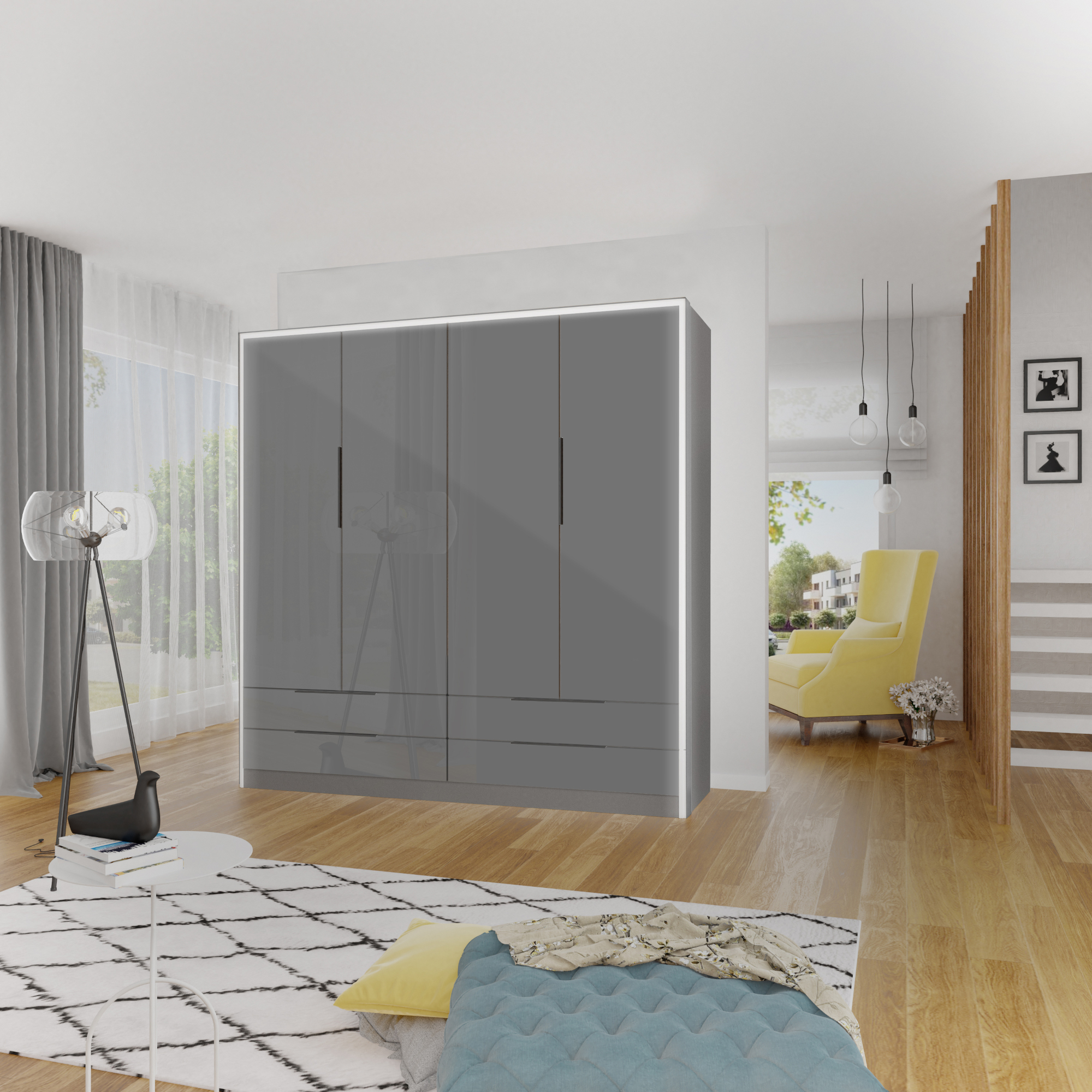 - 4 doors; 4 drawers; 4 shelves; LED light; 1 hanging rod; high gloss; white or gray