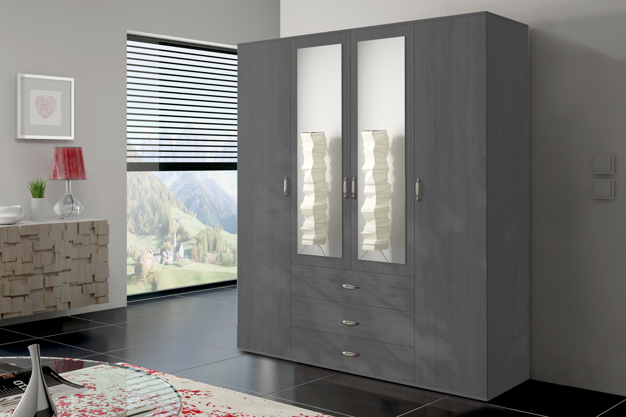 This jumbo wardrobe is constructed of sturdy and durable compressed wood. It has four doors that easily open to a spacious wardrobe. Behind the two outer doors, there are hanging rods which provide ample space to hang your short and long clothing. Behind the two center doors, there are two shelves that can be used to store folded clothes, shoes, linens and other essentials. Below the center doors there are three large drawers.