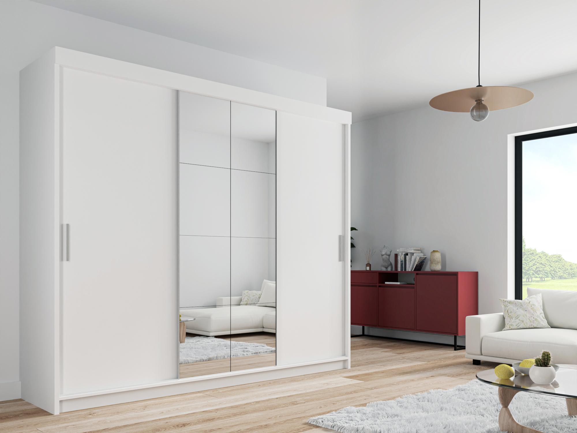 • One door is a full square mirror door, the other doors are the same color as the closet.