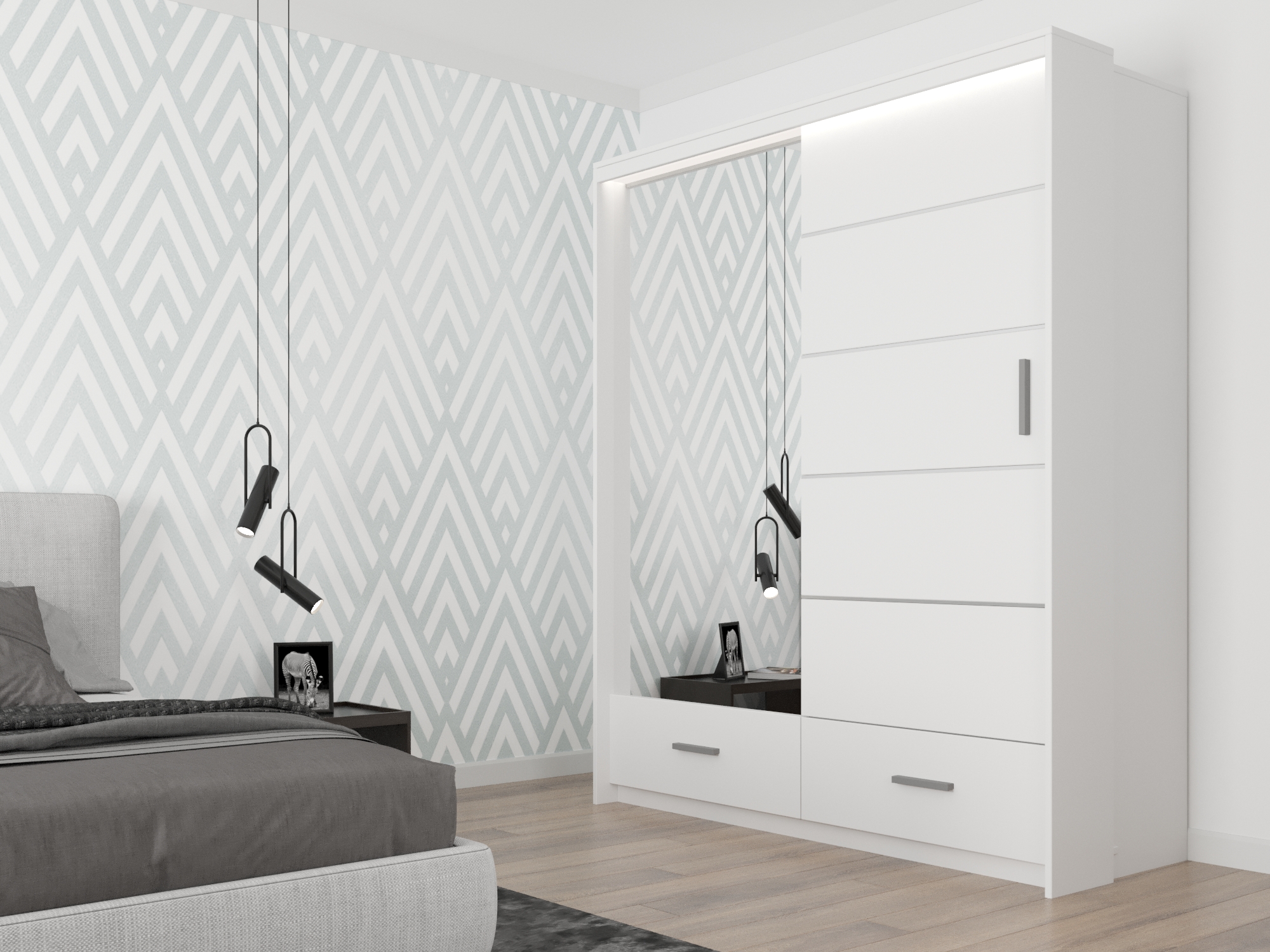 - 2 sliding doors; 2 outside drawers; 5 shelves; 1 hanging rod; LED light; one full mirror door