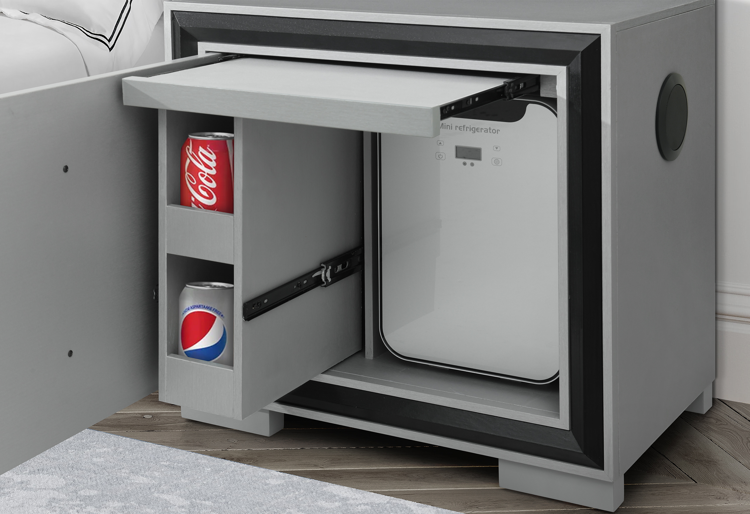 Each piece within the Amelia Bedroom Collection is crafted with attention to detail and durability in mind, ensuring that your investment stands the test of time. The bed becomes the centerpiece of your sanctuary with its plush upholstered headboard and innovative under-bed LED accent lighting, providing both comfort and ambiance. The accompanying case goods, including the dresser, nightstand, and chest, all feature the same cohesive design elements, such as sleek black drawer pulls, adding both visual interest and functionality to your space.