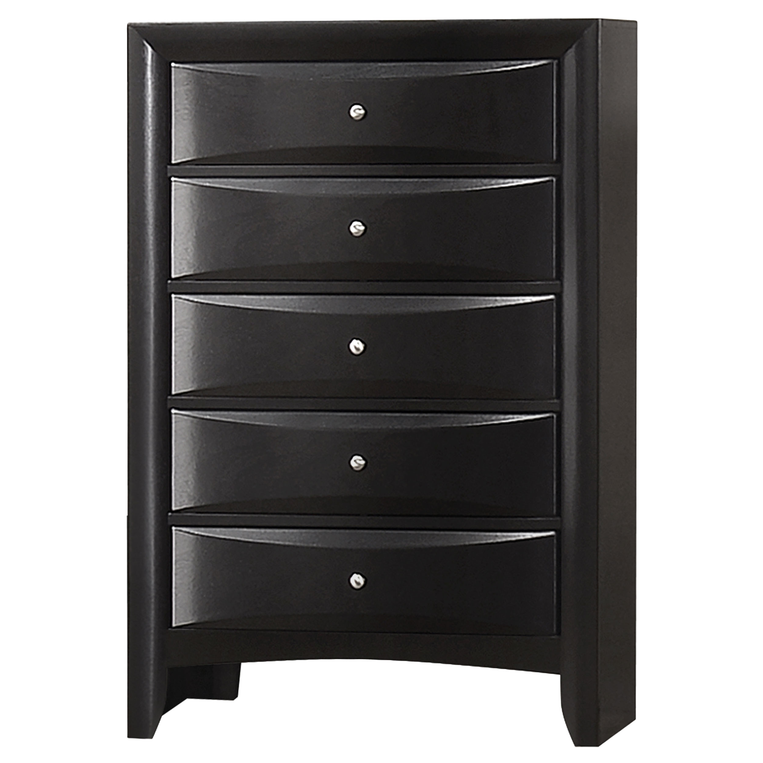 From the Briana collection comes this smooth, transitional style 5-piece bedroom set for a primary suite. The handsome storage bed offers function and fashion with drawers in the footboard as well as storage compartments behind drop down doors in the headboard and right side. The chest, nightstand, and dresser are constructed with plenty of drawers with chambered edge fronts and brushed chrome knobs, affording ample storage space with added stylishness. The straight, clean rectangular mirror easily fits upon the stately dresser finish out the set. The entire set is finished in timeless black that’s sure to match any home decor.