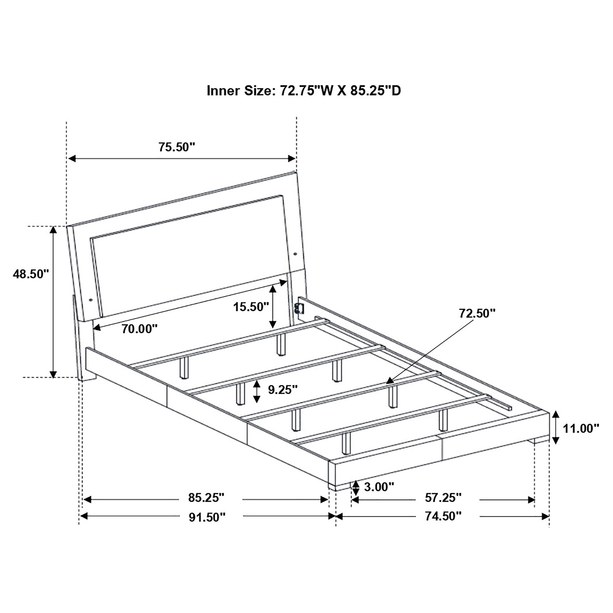 Modern design meets ambient lighting in this contemporary bedroom set. The bed features a white high gloss headboard with built-in blue LED lighting, activated by a convenient touch switch. A faux leather upholstered bed frame adds a refined touch, while matching storage elements offer smooth metal glides and chrome-finished details. With clean lines and integrated lighting, this set adds both functionality and visual impact to any modern bedroom.