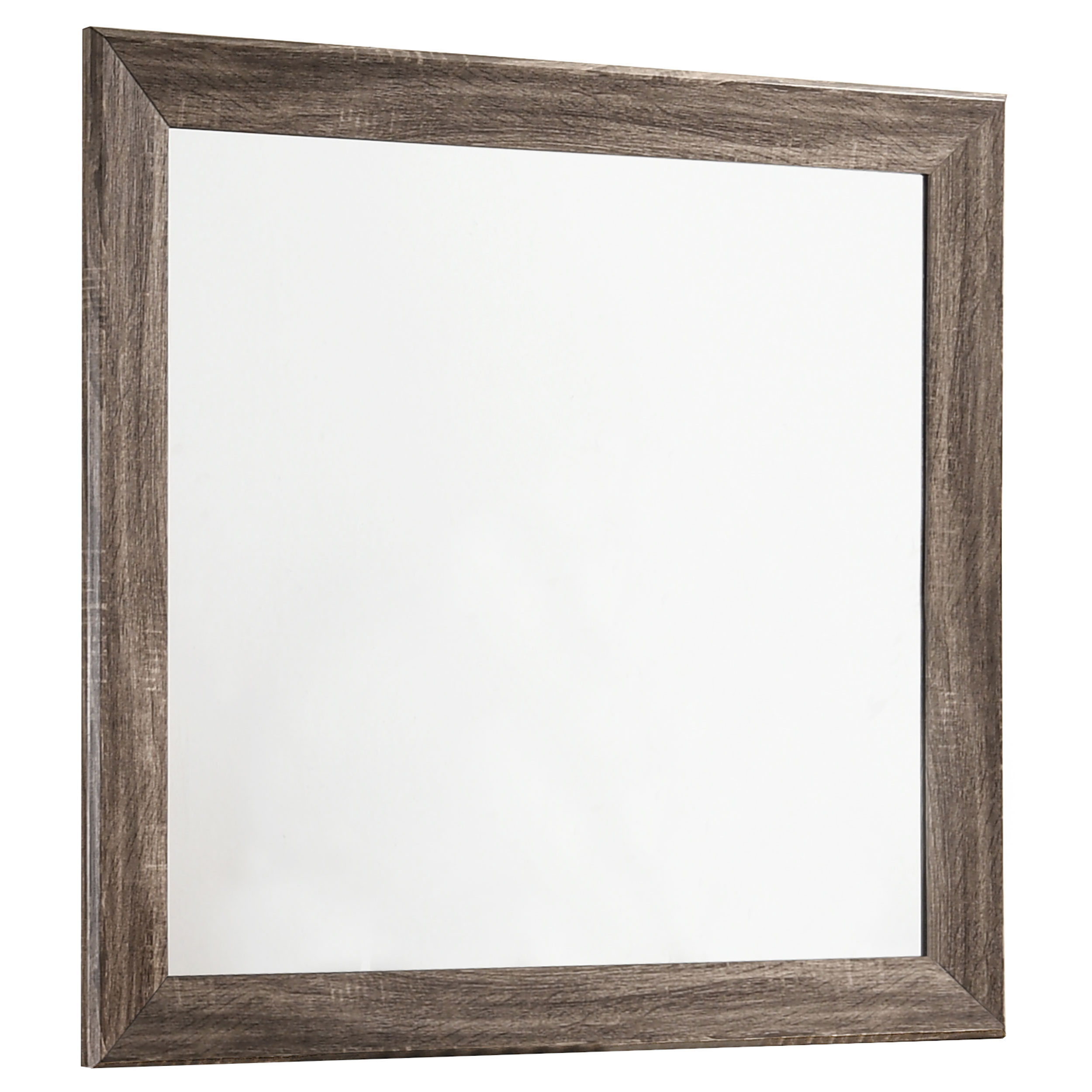 - Washed taupe finish features a warm wood grain look with black recessed grooves