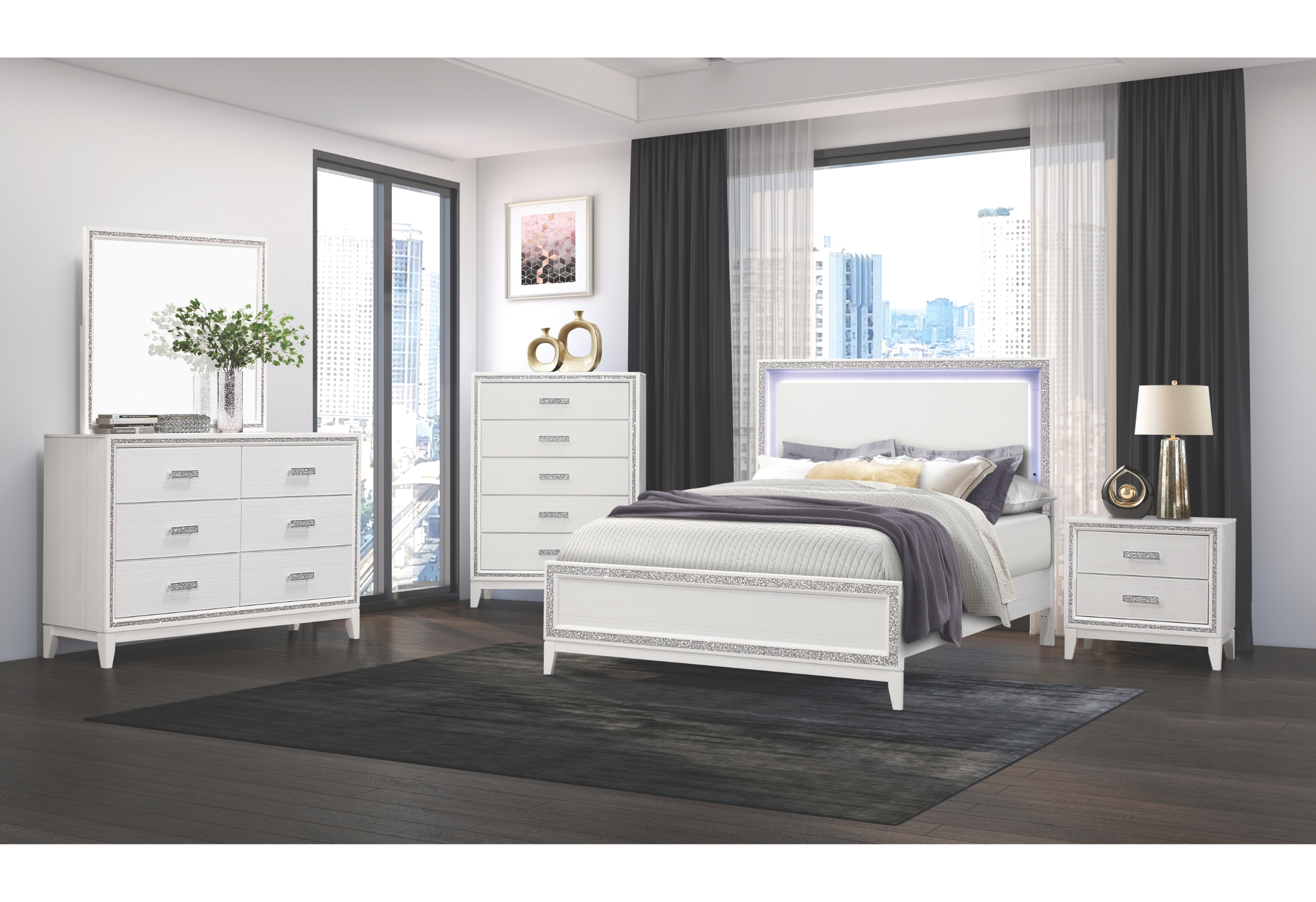 Lily bedroom brings two worlds together. The classic lines and modern accents create a beautiful transitional glam bedroom look. The crushed crystal like look outlines all the pieces along with LED lighting accenting the head board. The crushed crystal like design is not only used as an accent trim but is also carried over to the hardware. The end result is a beautiful glam bedroom.