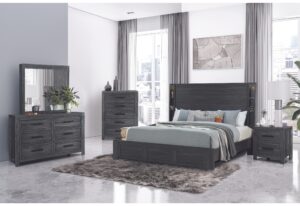 Introducing the Lisbon Grey/Black Collection from Global Furniture, a seamless blend of style and practicality that transforms any bedroom into a modern sanctuary. This sophisticated collection includes a bed, nightstand, dresser, chest, and mirror, each crafted with a striking contrast of grey and black finishes.