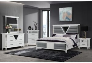 Elevate your bedroom to a new level of sophistication with the Marco Bedroom Collection from Global Furniture USA. This exquisite ensemble exudes modern glamour with its striking metallic white finish and dazzling mirrored accents that reflect light and style. Each piece is meticulously crafted to bring a touch of luxury to your space, while the infinity LED features on the dresser and bed create a serene, star-like ambiance. The bed, the centerpiece of the collection, boasts a plush upholstered headboard and footboard, offering a comfortable retreat at the end of the day. The Marco Collection is designed to impress, transforming any bedroom into a chic and inviting haven.