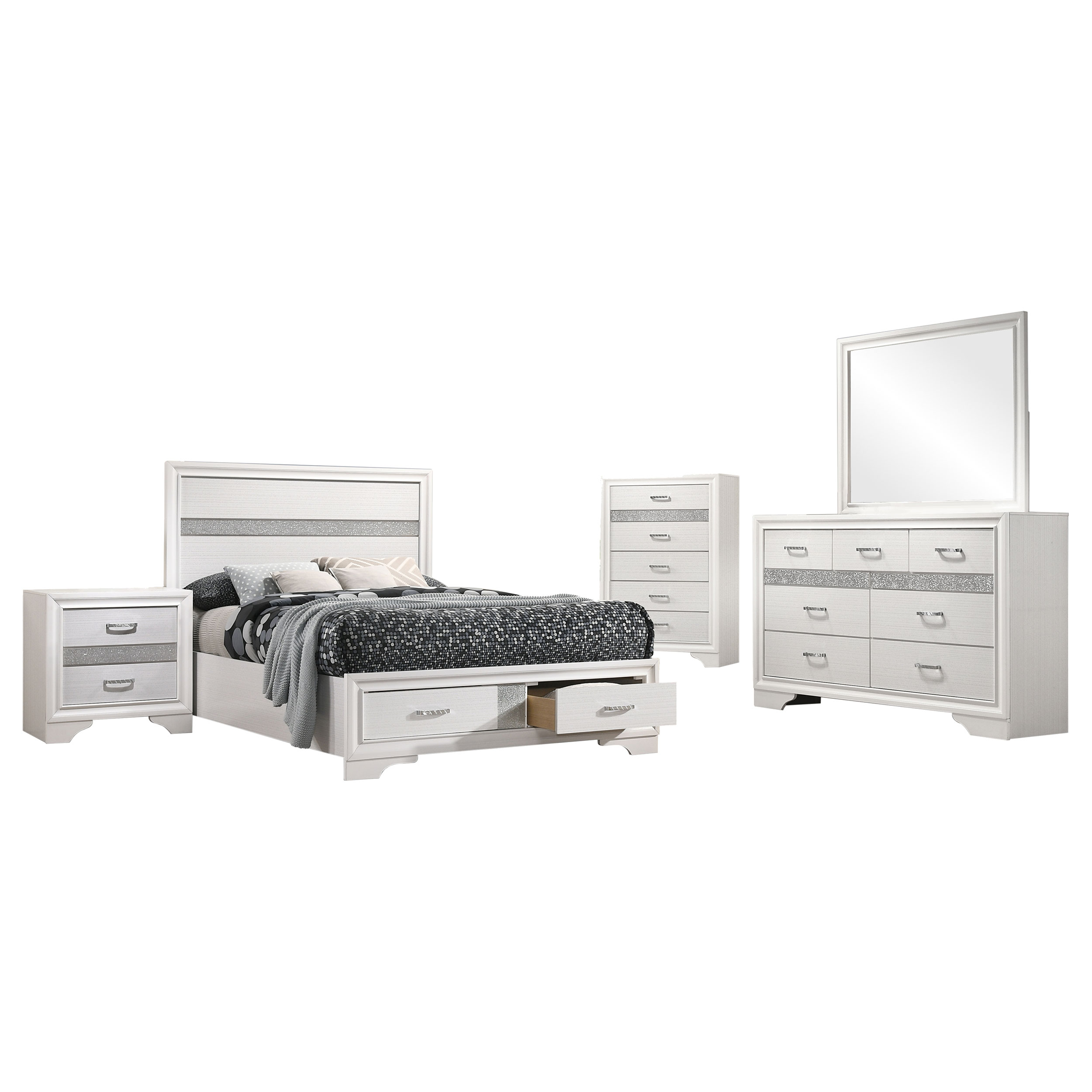 Stylish and ultra-chic, this glamorous, five-piece bedroom set is the ultimate in modern luxury. A bed, nightstand, dresser, mirror, and chest are all included, giving you everything you need to complete your bedroom ensemble. The mattress-ready platform bed offers the added bonus of footboard storage. The dresser, nightstand, and chest are also equipped with roomy drawers to maximize storage space. Glittery stripes and rhinestone detailing add a brilliant touch of bling to this exquisite bedroom set.