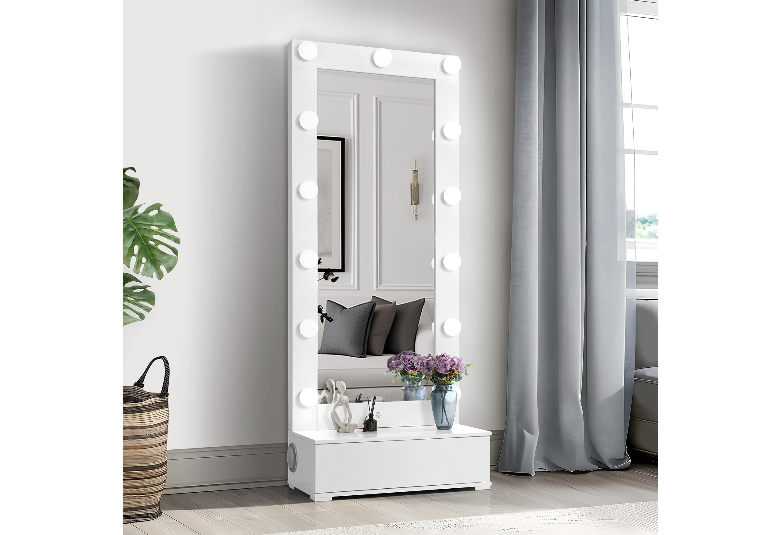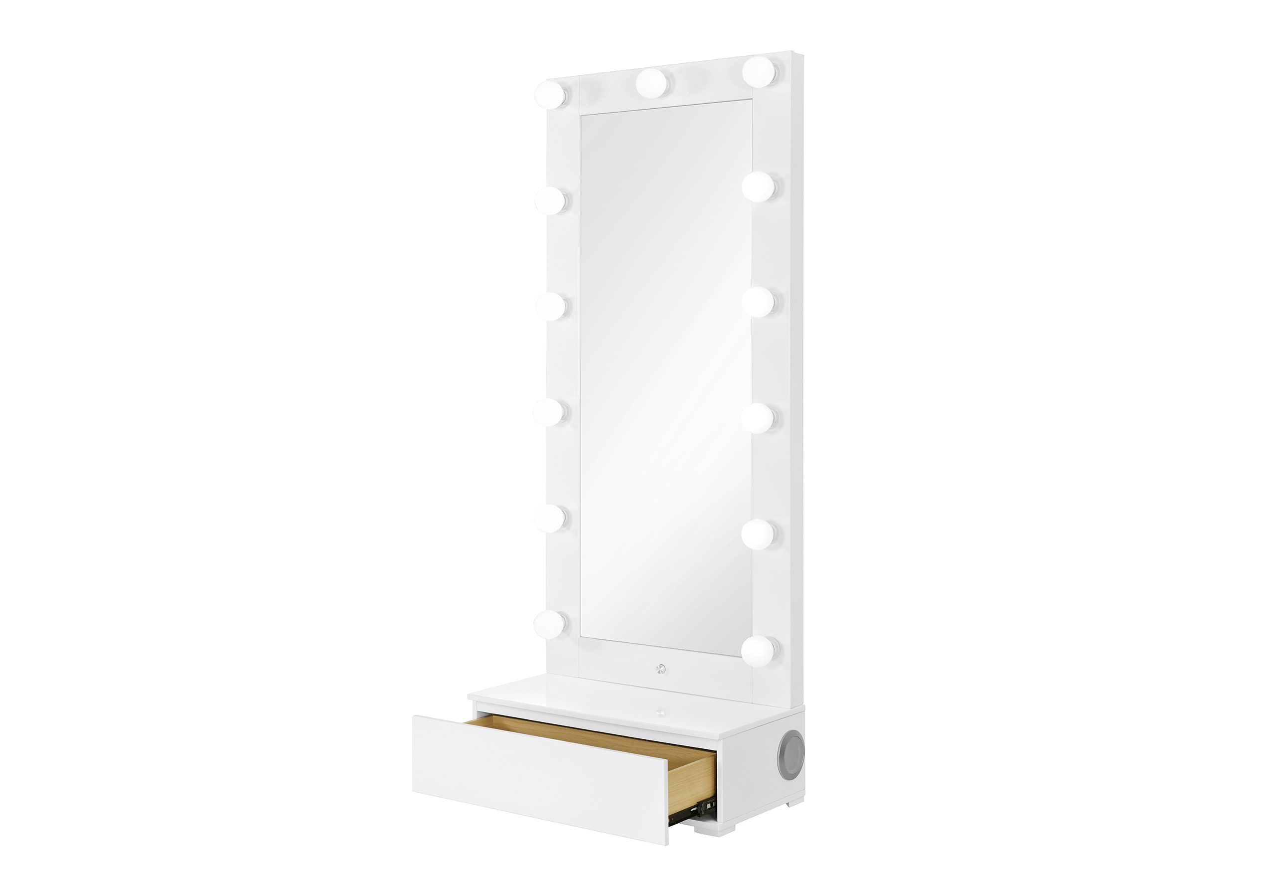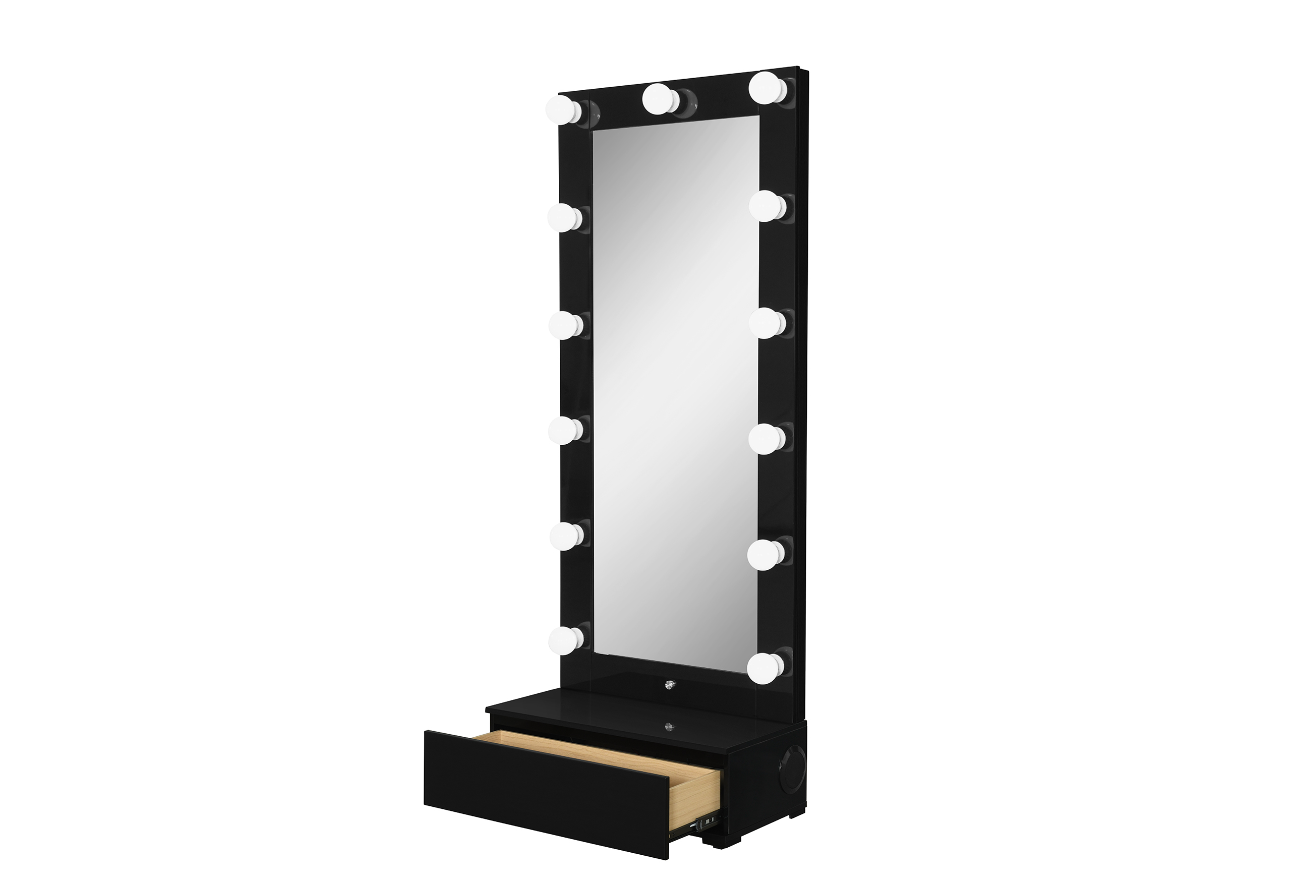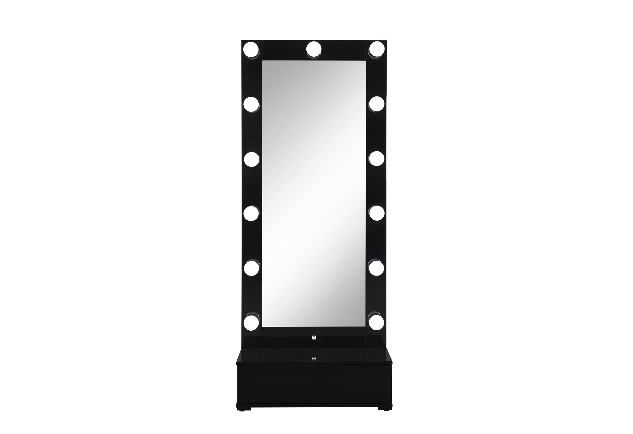The Ella Black Narrow Mirror with Drawer by Global Furniture is a sleek and functional addition to any modern bedroom or dressing space. This floor-length LED mirror offers full-body visibility with elegant, built-in lighting to brighten your look and your room. Finished in glossy black, it features a discreet storage drawer for accessories or daily essentials, and a built-in speaker to enhance your routine with music or audio.