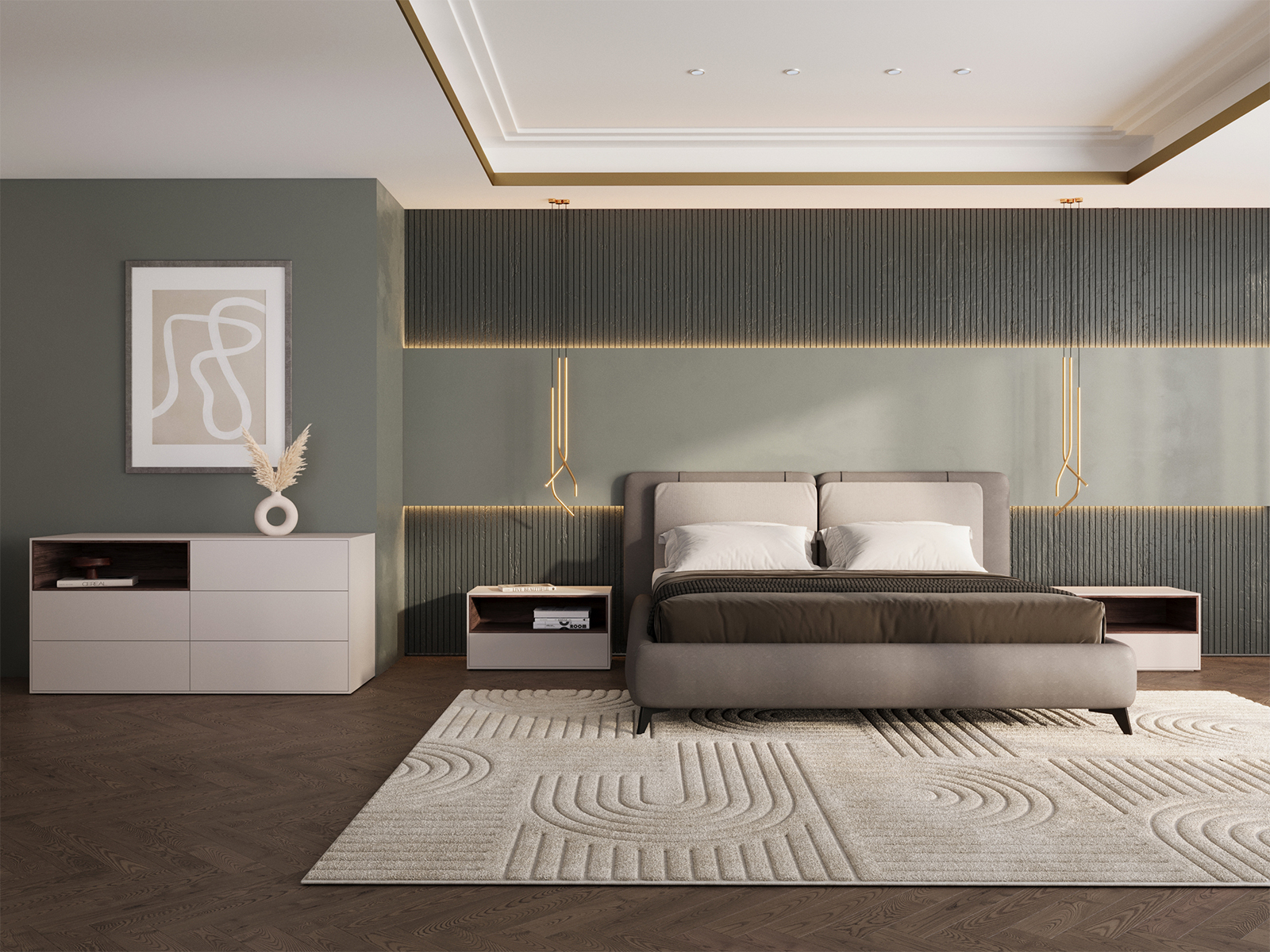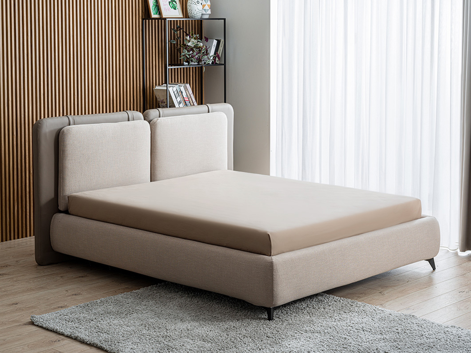 - Ayla queen storage bed in taupe linen fabric.
