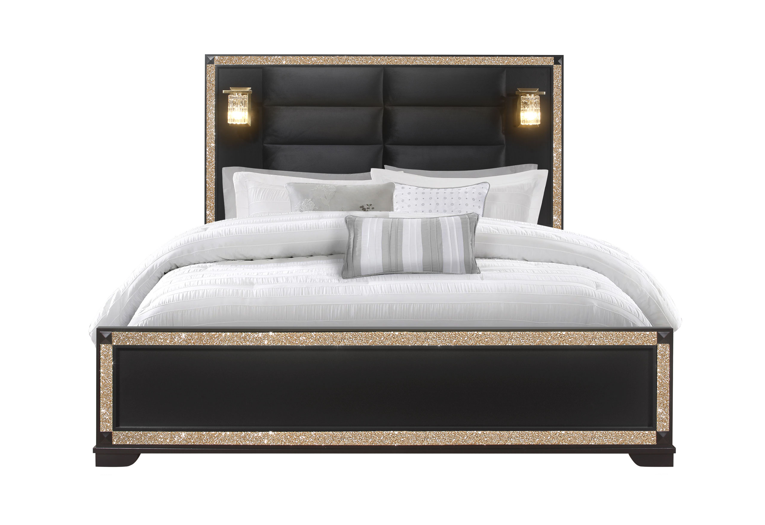 The Blake collection combines style and elegance with many beautiful features. The collection is outlined with gold colored crushed crystal to highlight its unique design. The Bed has a tall headboard and two lights along with quilted padding. The lights add style, design and function which can be used as reading lights. The quilted padding complements the design and adds comfort. All the other pieces have the black finish and crushed gold crystal outline complemented by the black and gold hardware.