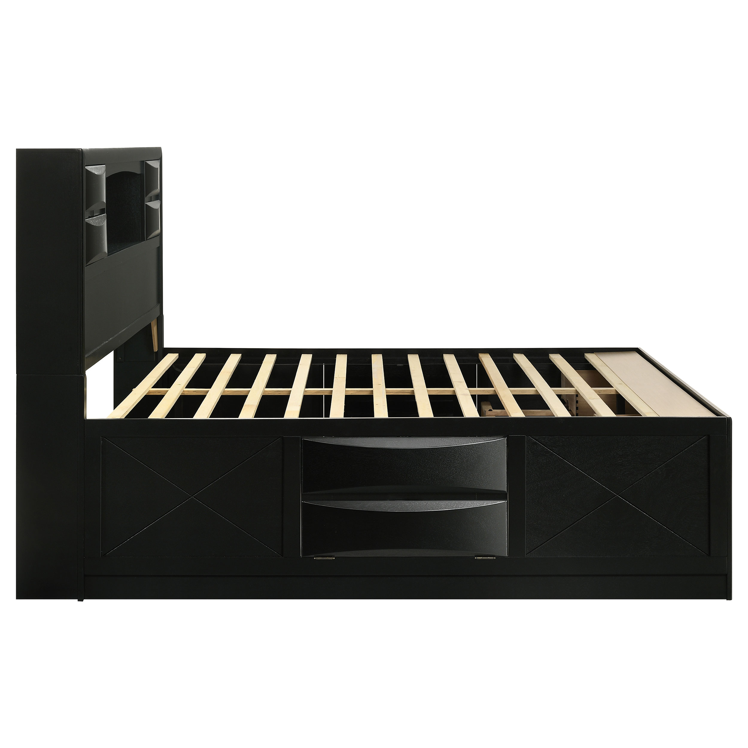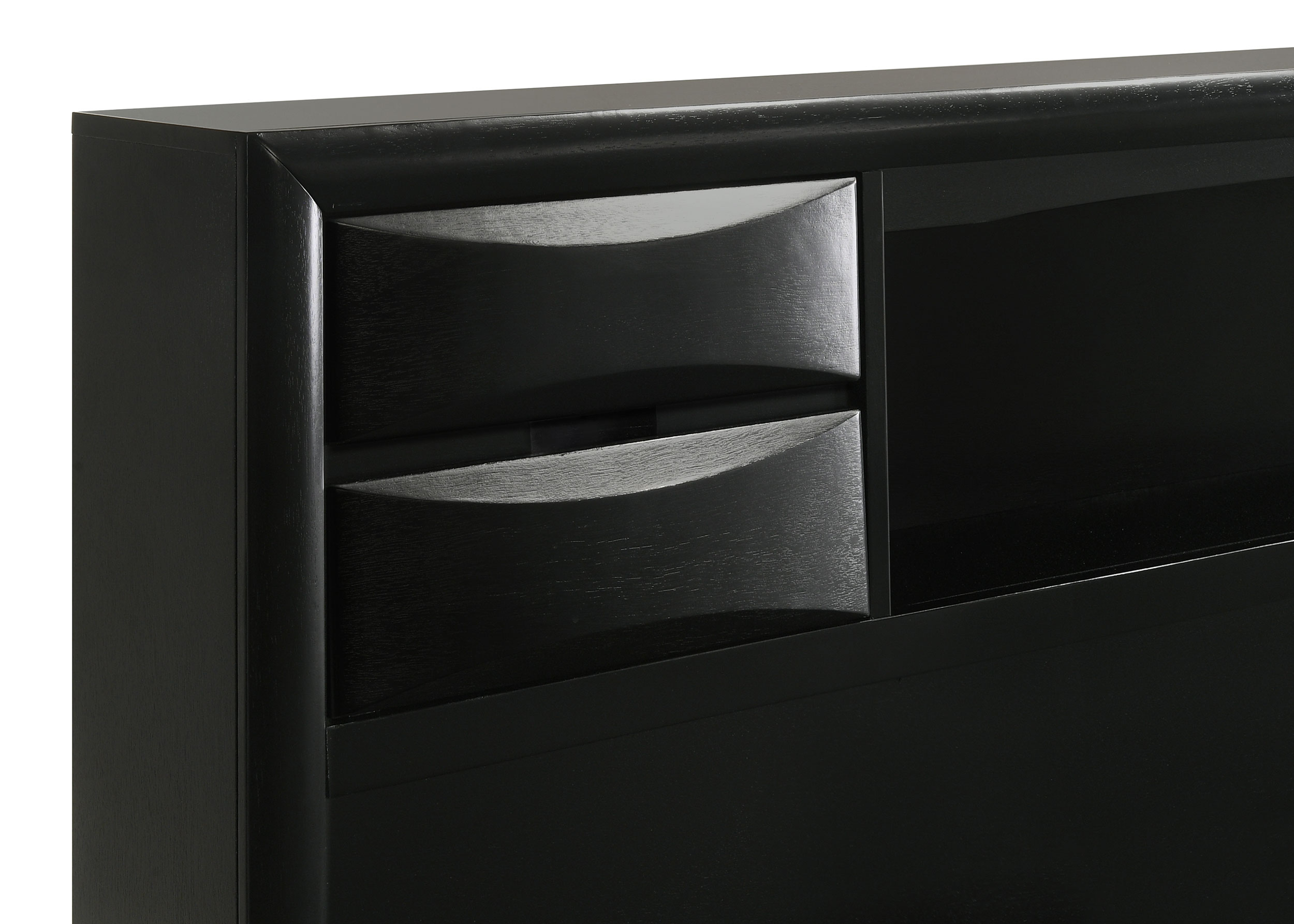 Update a bedroom with the open and geometric details from this California king storage bed. Add depth with the chamfered edge drawer fronts that line the simple silhouette. The headboard is full of clean lines and features drop down compartments and a shelf. making it perfect for a primary suite of any size. The frame and sleek black finish from this transitional design look great in any modern space. The footboard features four drawers while the right side has a drop down compartments, perfect for storing linens and clothing.