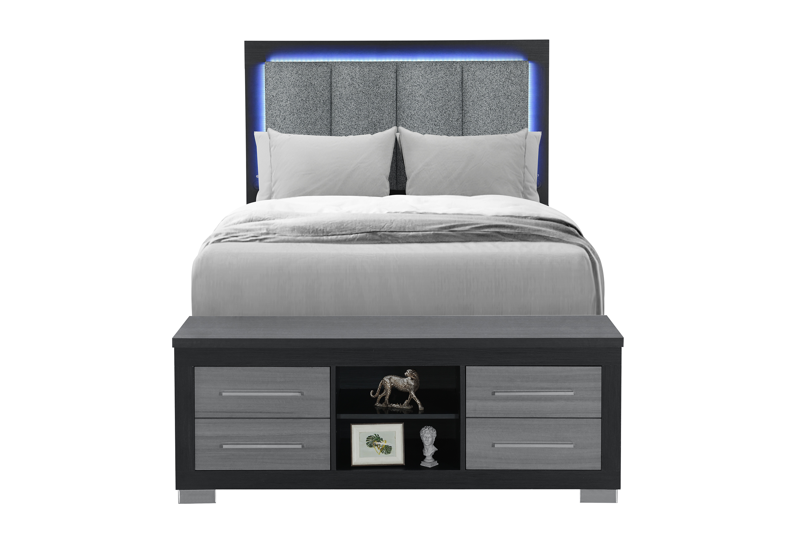 The Emma Full Bed is the centerpiece of this stunning collection, blending modern elegance with unparalleled functionality. The padded grey upholstered headboard features an LED light and USB ports for added convenience, perfect for reading or charging devices. With its ingenious all-around storage design which provides ample space for bedding, clothing, and more. The two-tone black and grey finish completes the contemporary look, making this bed a true standout in any bedroom.