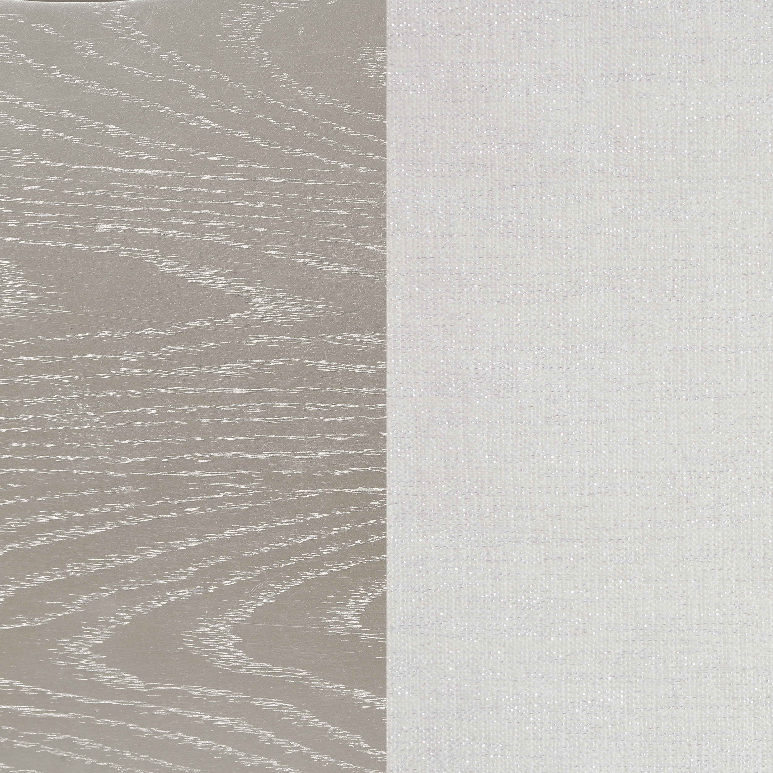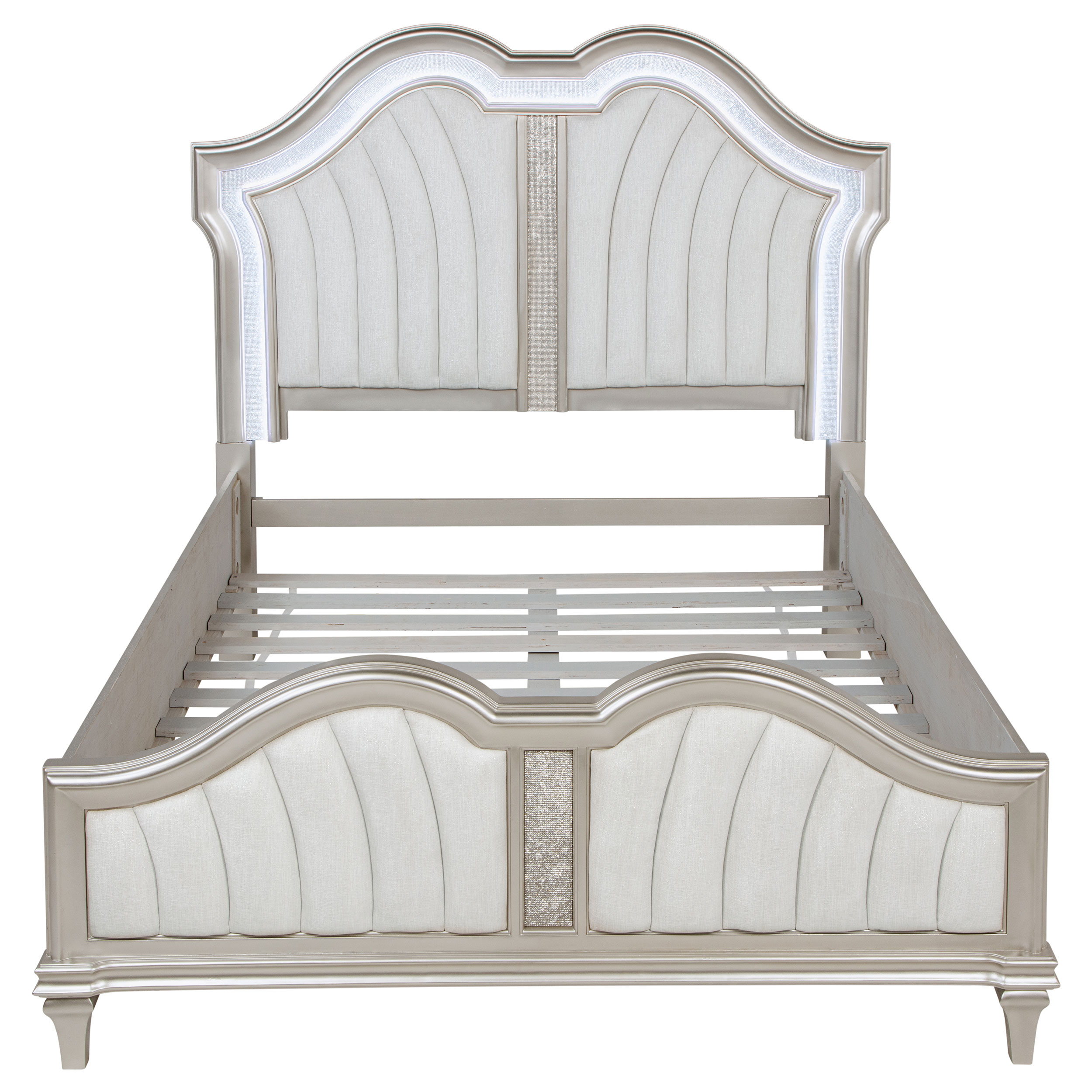 Elevate your restful bedroom retreat with this elegant, glam platform bed. A curvy double arch headboard and footboard are designed with a padded insert of flared channel tufting that lends an eye-catching motif. Each padded piece is upholstered in a soft, ivory fabric that lends a neutral color palette. A silver oak finished frame gives off a chic pearlescent look and feel, accented by glittering panels that rest flush between the crown molding and trim details throughout. Slender, tapered legs offer a subtle lift, allowing for extra storage beneath.