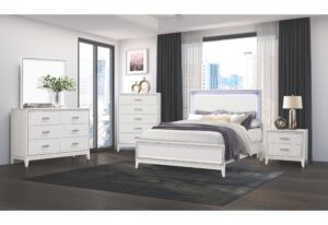 Introducing the Jordyn Bed Group from Global Furniture USA, the ultimate statement for any bedroom. The bed is designed with a platform design, eliminating the need for a box spring while adding room for storage drawers. The headboard features built-in lighting and two storage drawers for convenience. All case pieces are lacquer finished and feature nickel hardware. Upgrade your bedroom with the Jordyn Bed Group and enjoy its sleek and modern design for years to come.