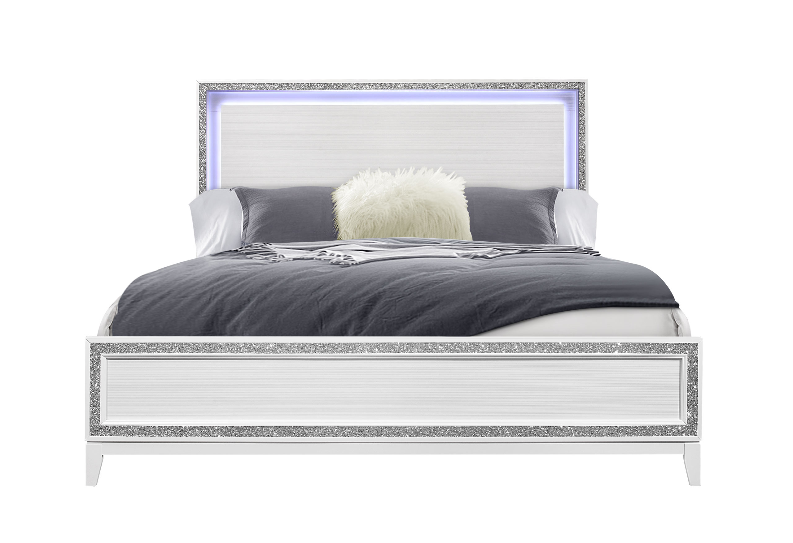 Lily bedroom brings two worlds together. The classic lines and modern accents create a beautiful transitional glam bedroom look. The crushed crystal like look outlines all the pieces along with LED lighting accenting the head board. The crushed crystal like design is not only used as an accent trim but is also carried over to the hardware. The end result is a beautiful glam bedroom.