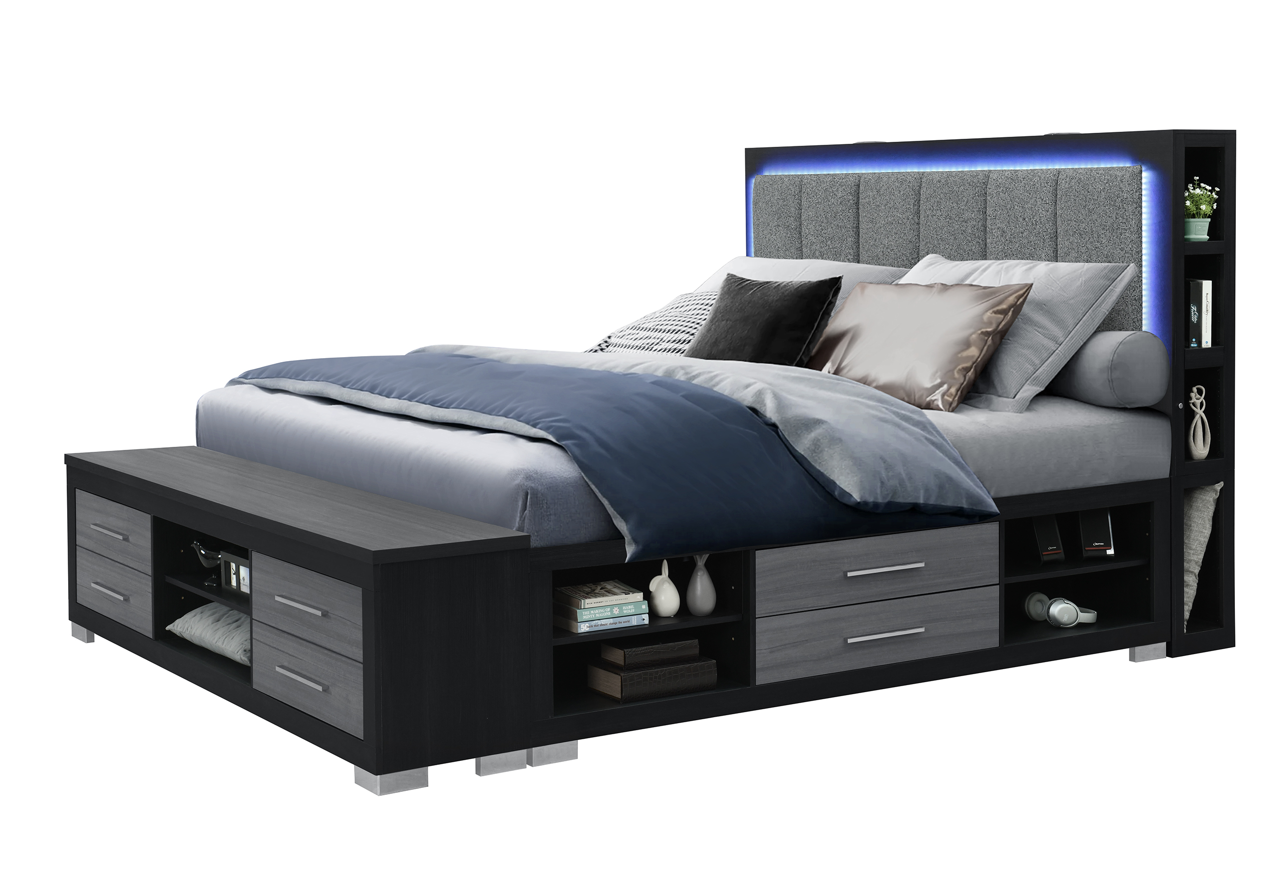 Elevate your bedroom with the Madison Queen Bed, where contemporary design meets ultimate functionality. The headboard features grey upholstery, an integrated LED light, and a USB charging port to keep your devices powered. Two built-in speakers deliver quality sound, creating a relaxing ambiance. Ingenious storage cubbies on each side of the headboard, provide space for books, devices, or decor. His & her safe on each side of headboards adds security to this already functional piece. Designed for practicality, the bed offers all-around storage, ensuring you have ample room for all your bedroom essentials. The sleek black and grey finish adds a sophisticated touch to this versatile centerpiece.