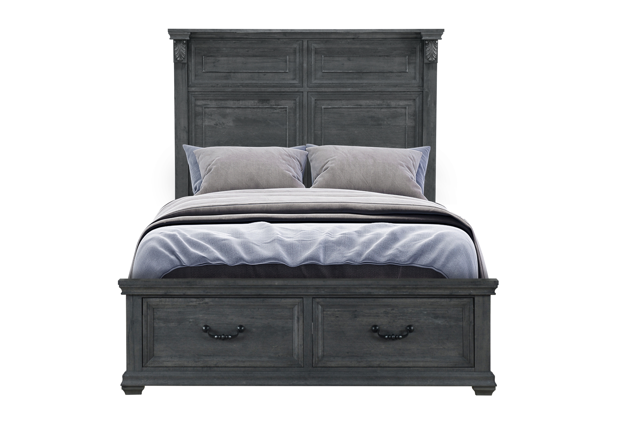 The Tatum Bedroom Collection is crafted with a rustic wood finish available in natural or grey, this classic collection boasts intricate trim, rustic drawer hardware, and elegant scroll work on every piece. The large panel headboard on the bed adds a grand touch to your bedroom. The footboard storage enahnces the functionality of the Tatum set maximizing the benefits.