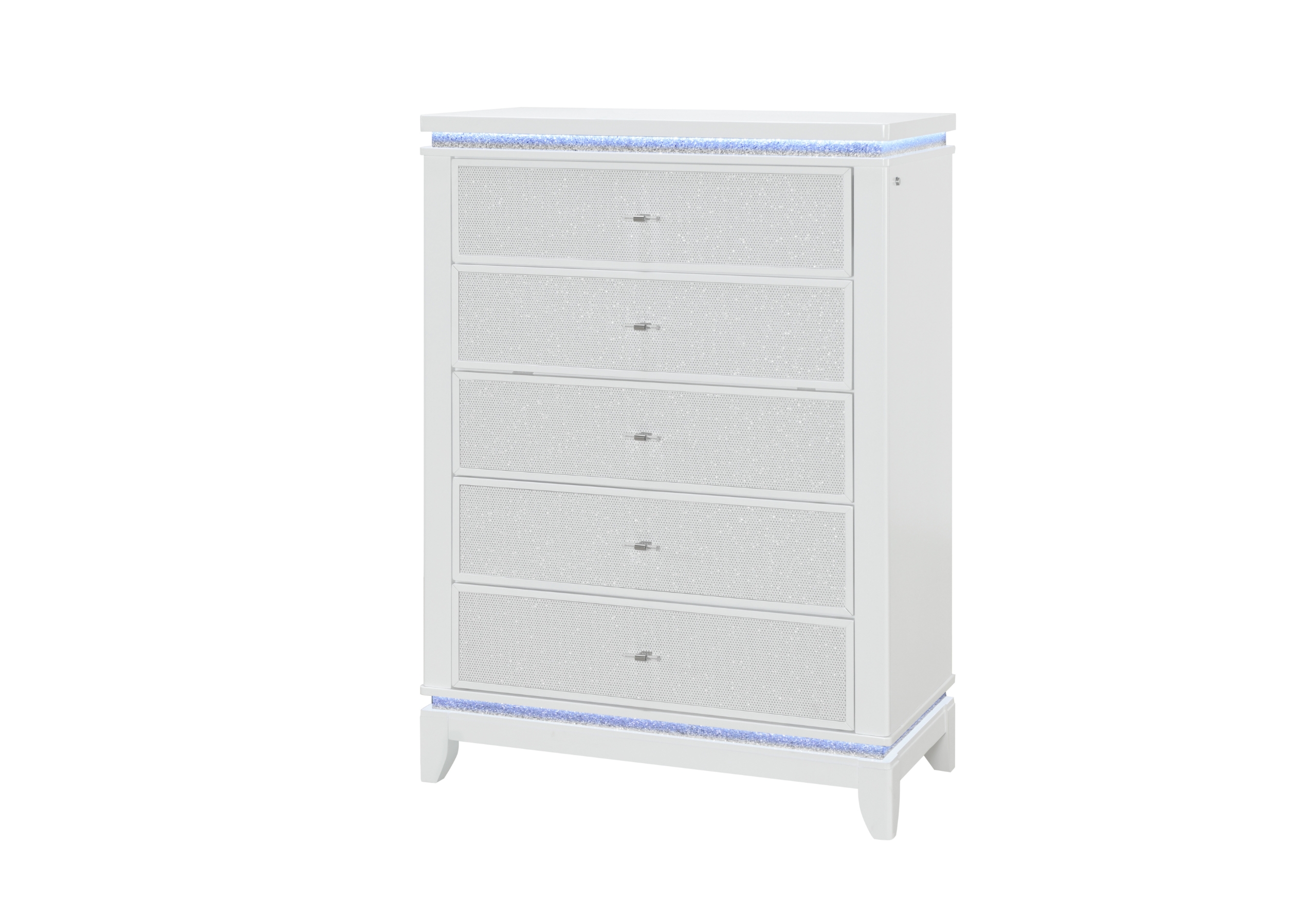 Maximize your bedroom’s storage and style with the Alina Chest. Standing tall, this piece features the signature crushed glitter and LED accents, along with the perforated silver glam fronts that add a touch of sparkle. Five generously sized drawers glide smoothly, making organization an effortless and elegant affair.