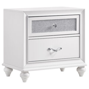 Complete the decor of your personal space in stunning, sparkling style. Beautifully adorned with acrylic glitter panels, this five-drawer dresser transforms any bedroom into a glamorous retreat. Faceted crystal hardware adds an extra pop of polish. A crisp, clean white finish gives it a posh yet pristine look. Pair this wooden chest with matching bedroom furniture for a spectacular ensemble that’s fit for modern royalty.