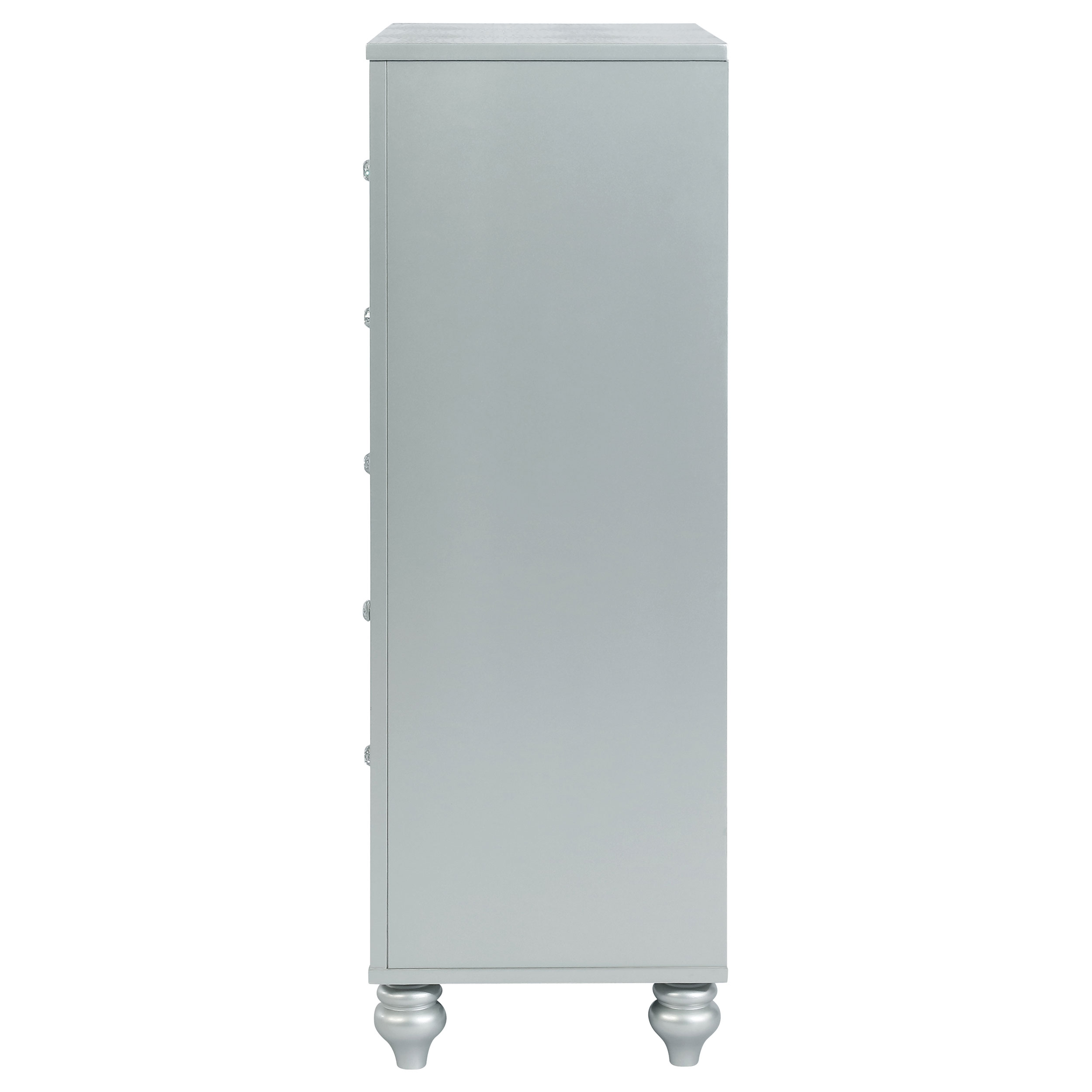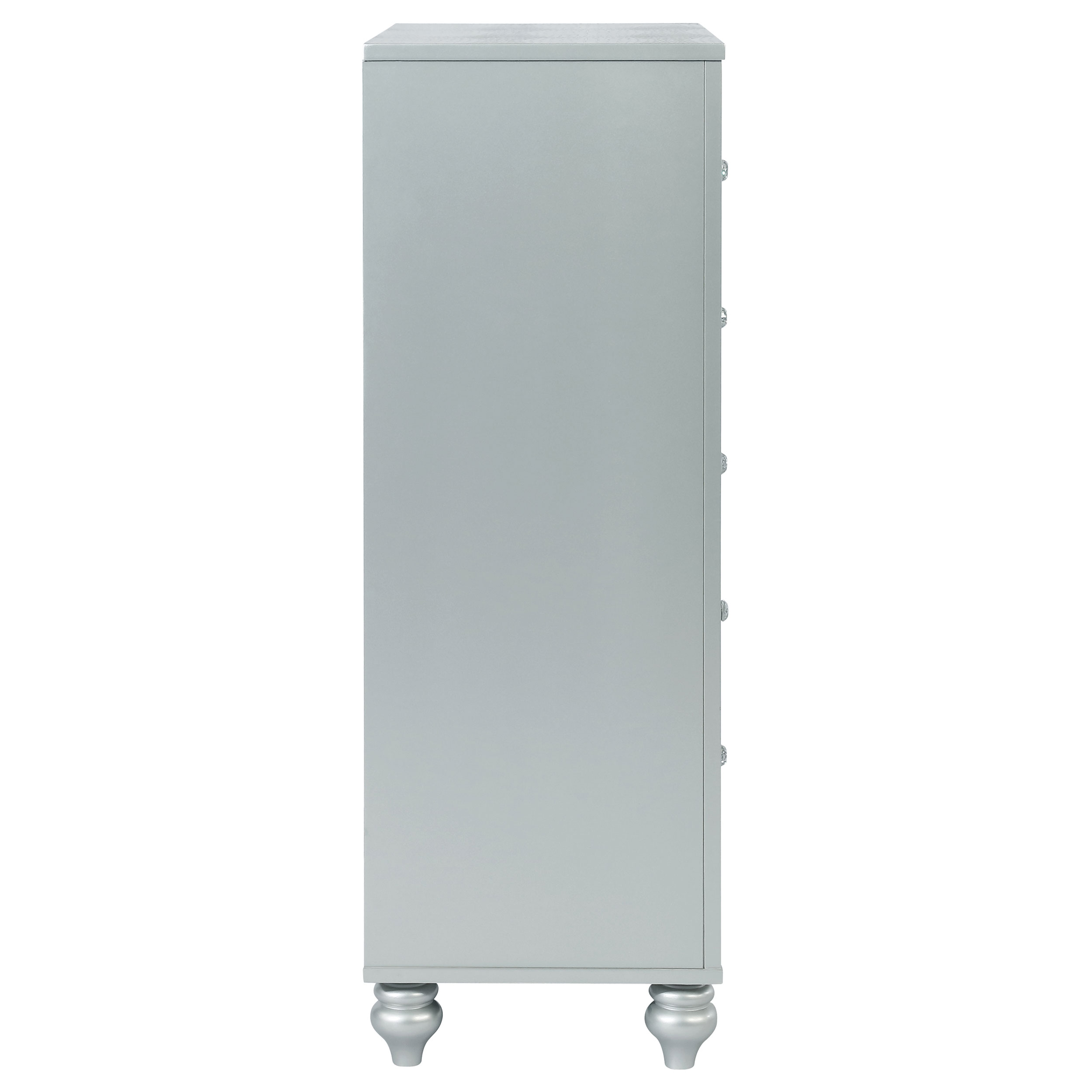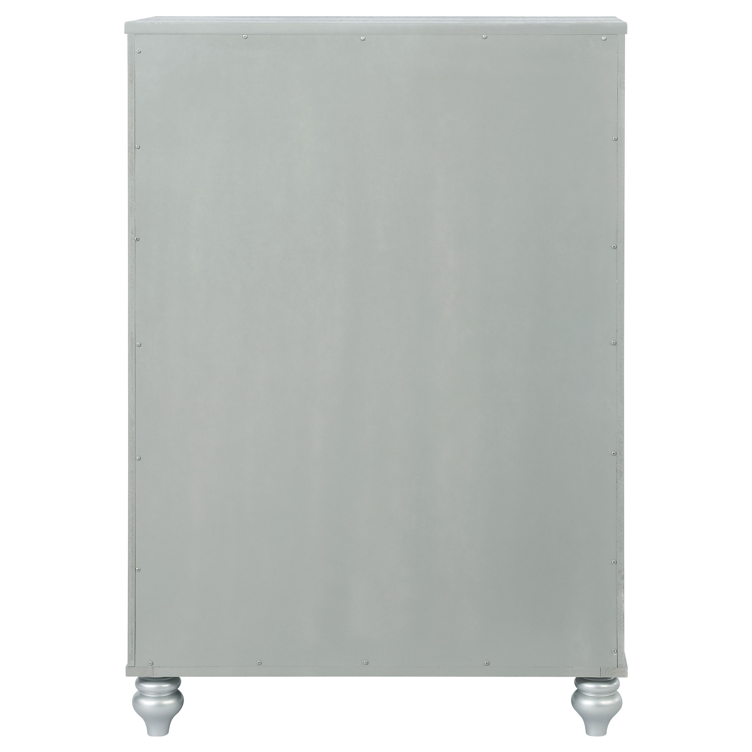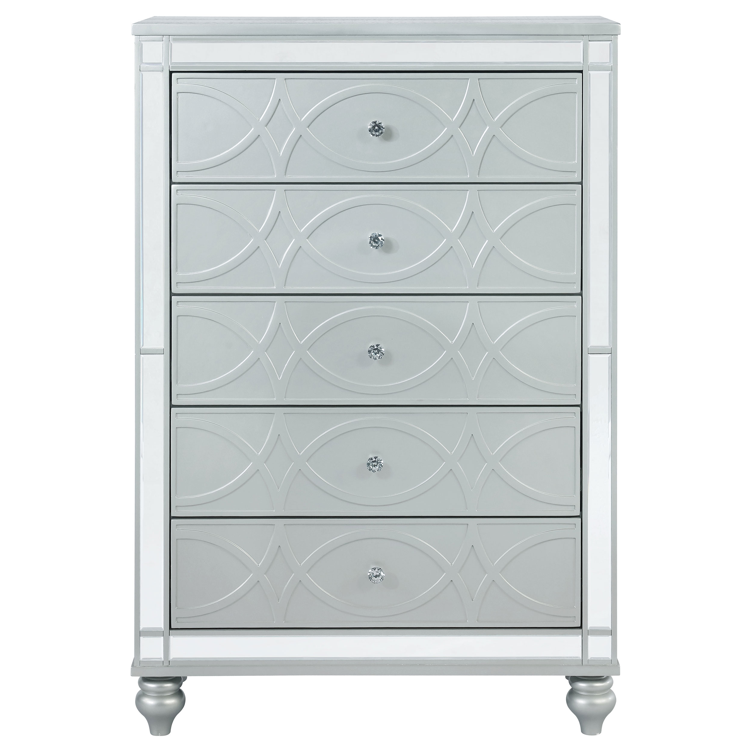 Enhance your home with a modern glam update to a classic design with this transitional five-drawer chest. It boasts a dazzling design that takes lends glitz to any modern bedroom. It comes in a vibrant silver metallic finish with fret work detail on the front panels and drawer fronts. The drawers are adorned with crystal-like pulls and the top ones are lined with black felt to protect treasured valuables. Delicate bun feet complete the design of this exquisite masterpiece.