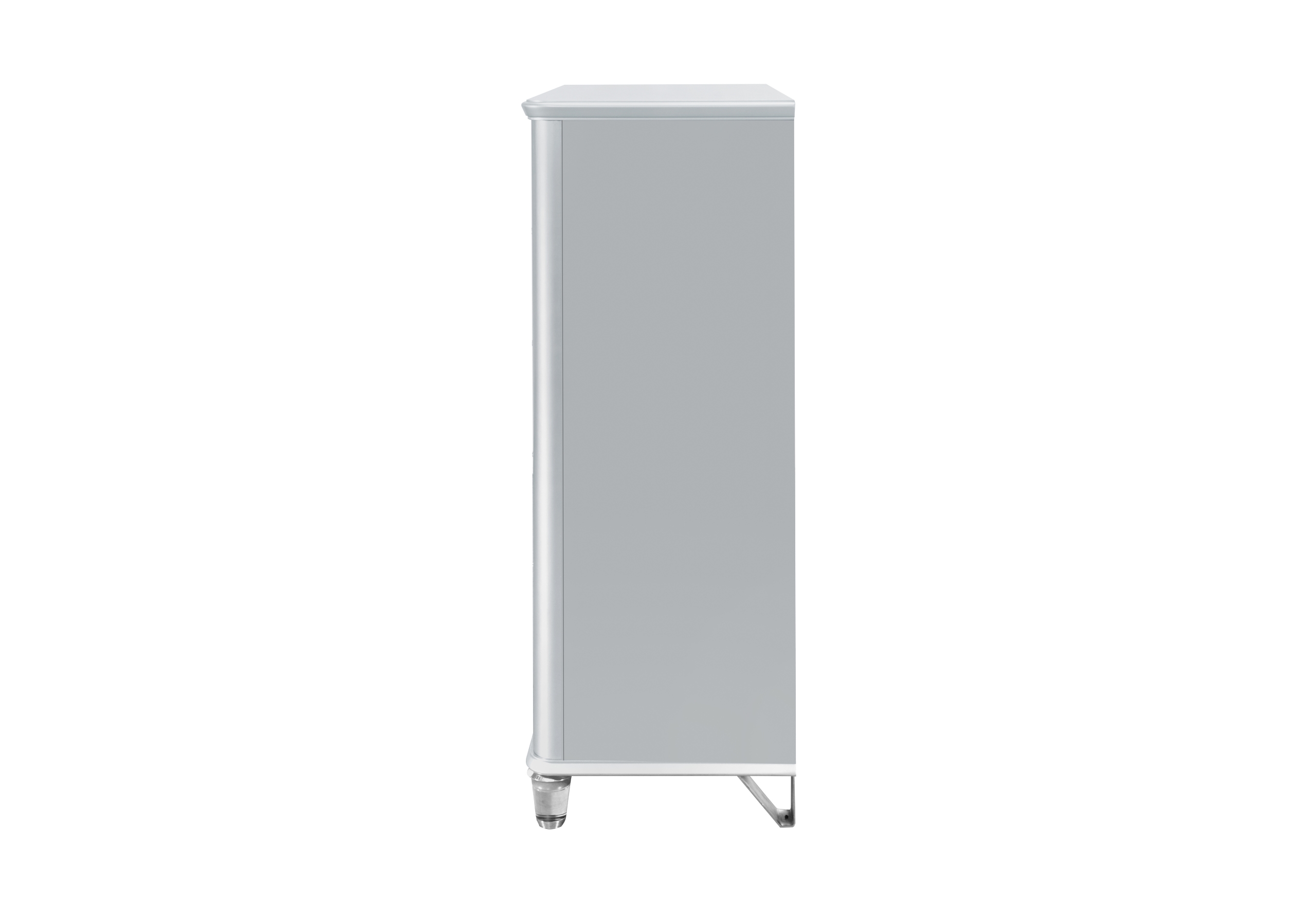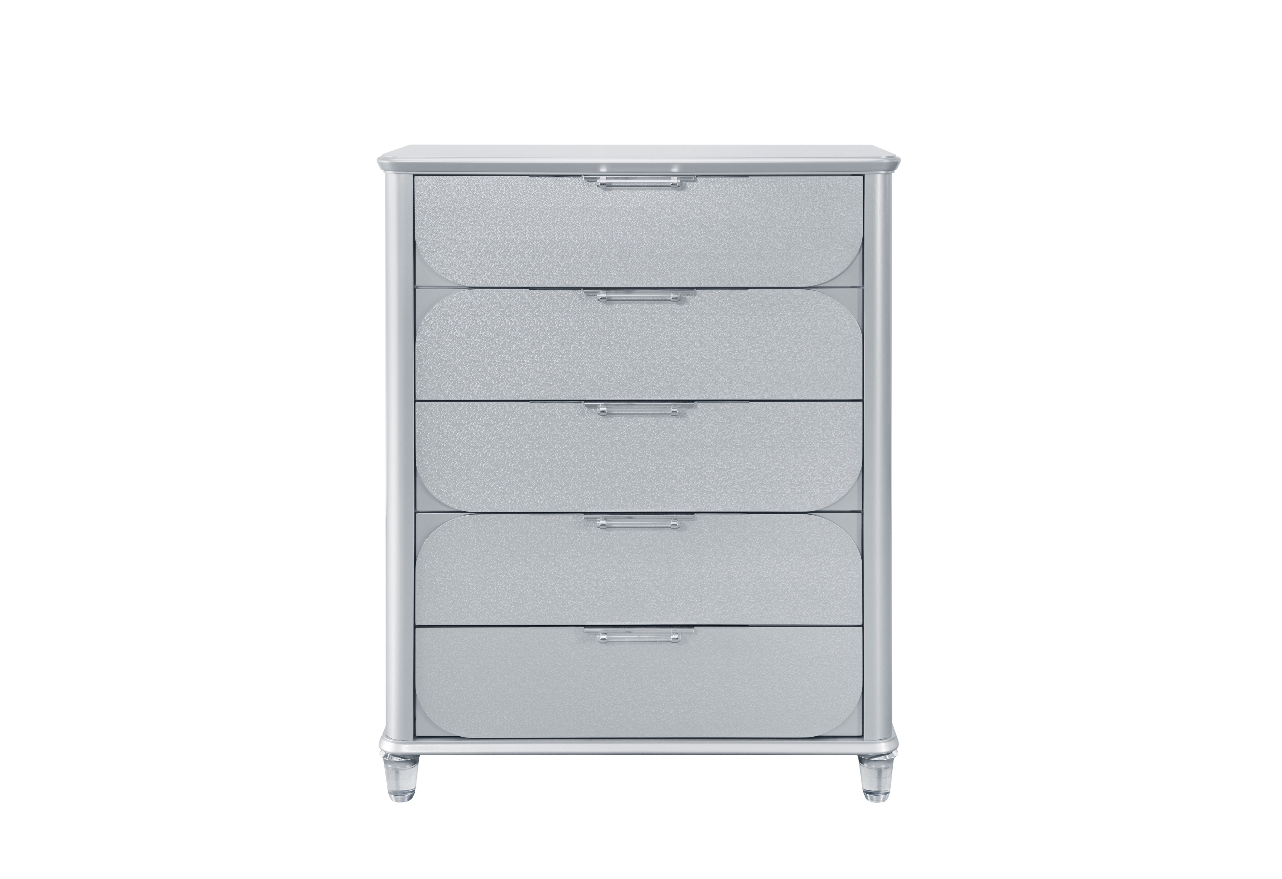 The Lando Chest is a perfect blend of modern style and utility. Featuring a sophisticated grey finish and chic acrylic accents, this chest offers ample storage with its full extension drawers and top felt-lined drawers. The textured drawer fronts add a unique touch, making this chest a standout piece in any bedroom.