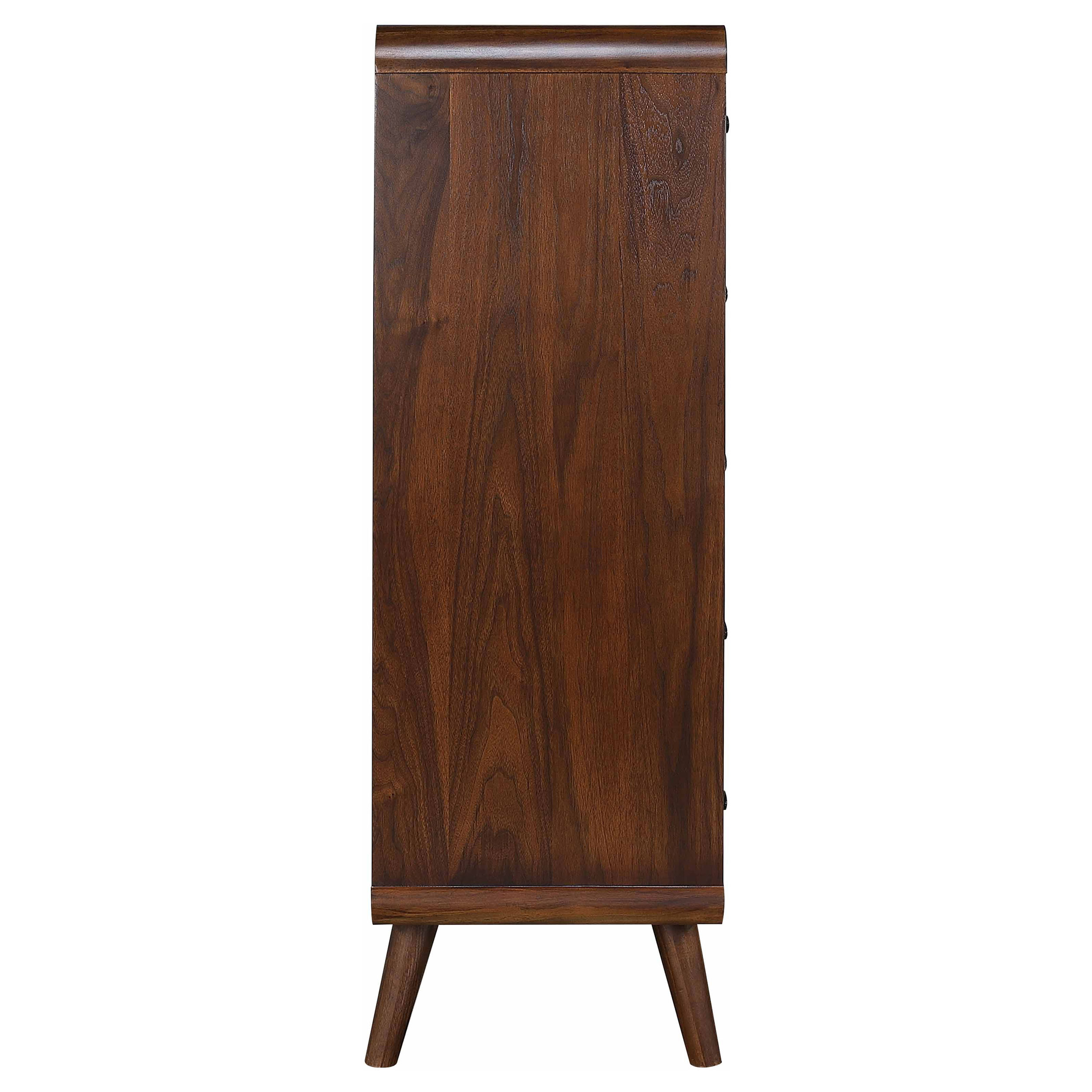 Stylishly organize your wardrobe with this mid-century modern chest of drawers, built with pine, engineered wood, and walnut veneer for durability and style. Featuring five spacious drawers, it offers ample storage for clothing and accessories. Rounded edges and tapered legs lend retro flair, while felt-lined top drawers add a touch of functionality. Smooth drawer glides and subtle metallic hardware complete this elegant storage piece.