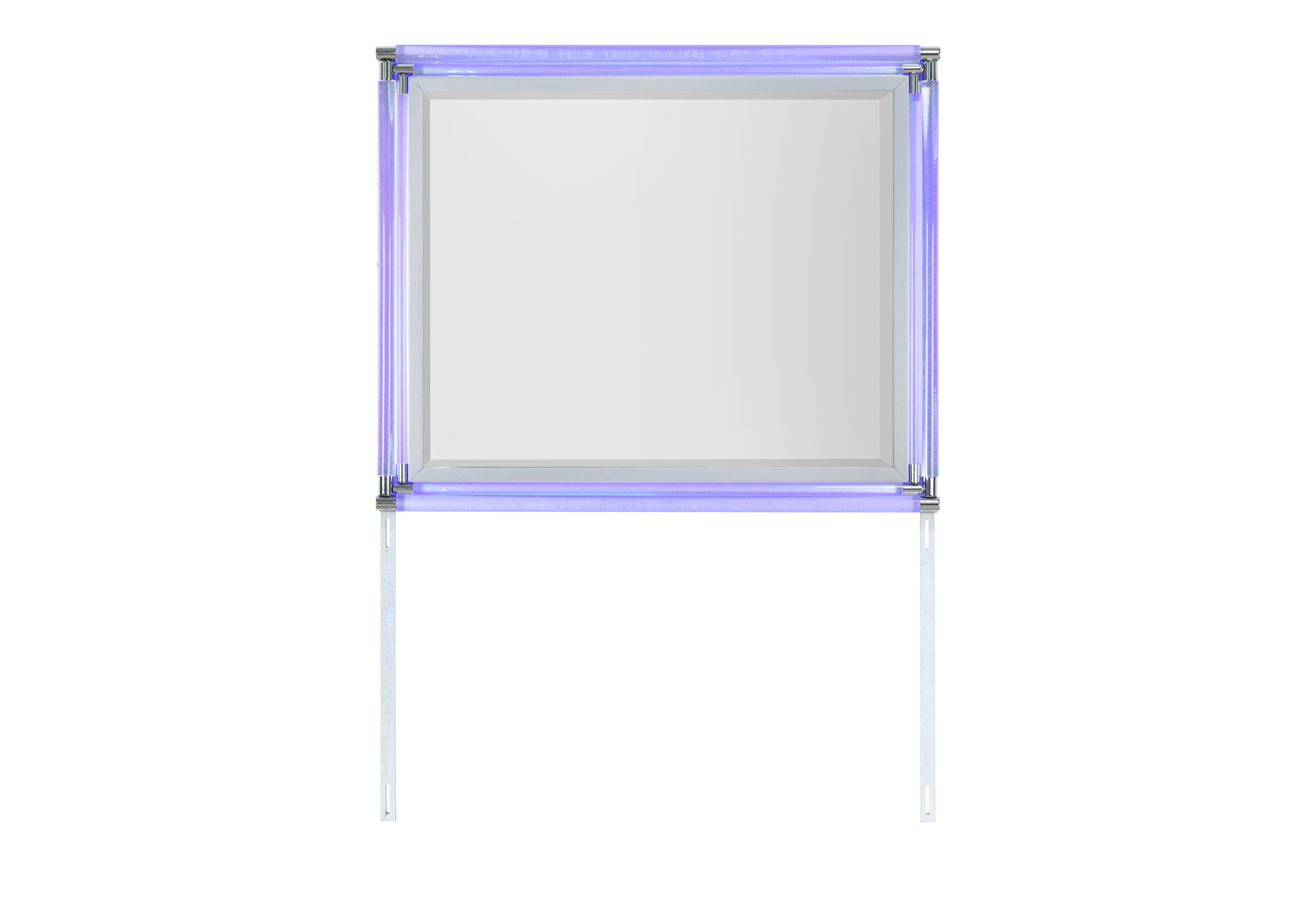 The Lando Mirror adds a touch of modern elegance to your bedroom decor. Framed in sleek grey with acrylic accents, this mirror features integrated LED lighting, enhancing the room’s brightness and depth. It pairs perfectly with the Lando Dresser for a cohesive and stylish look.