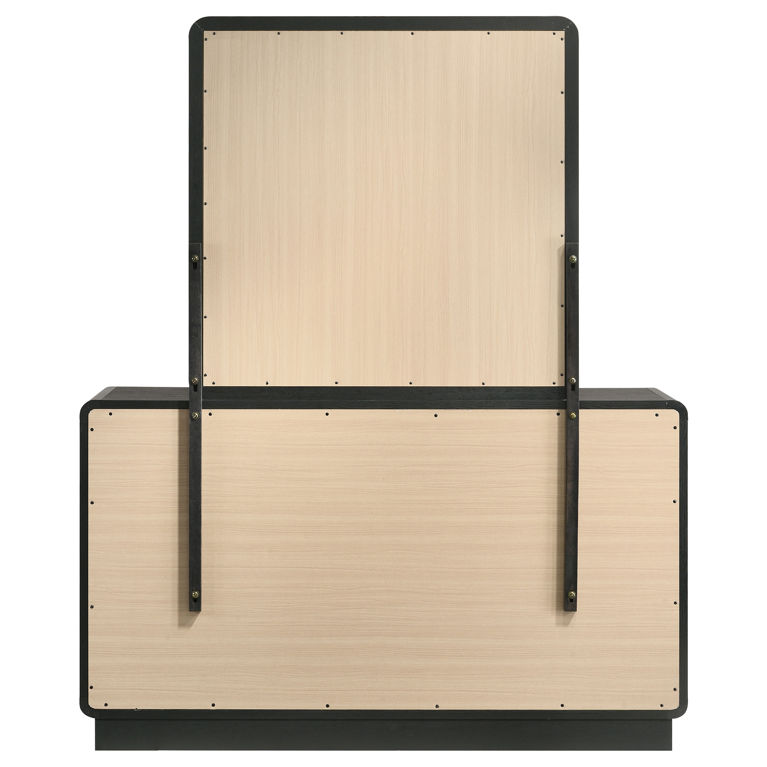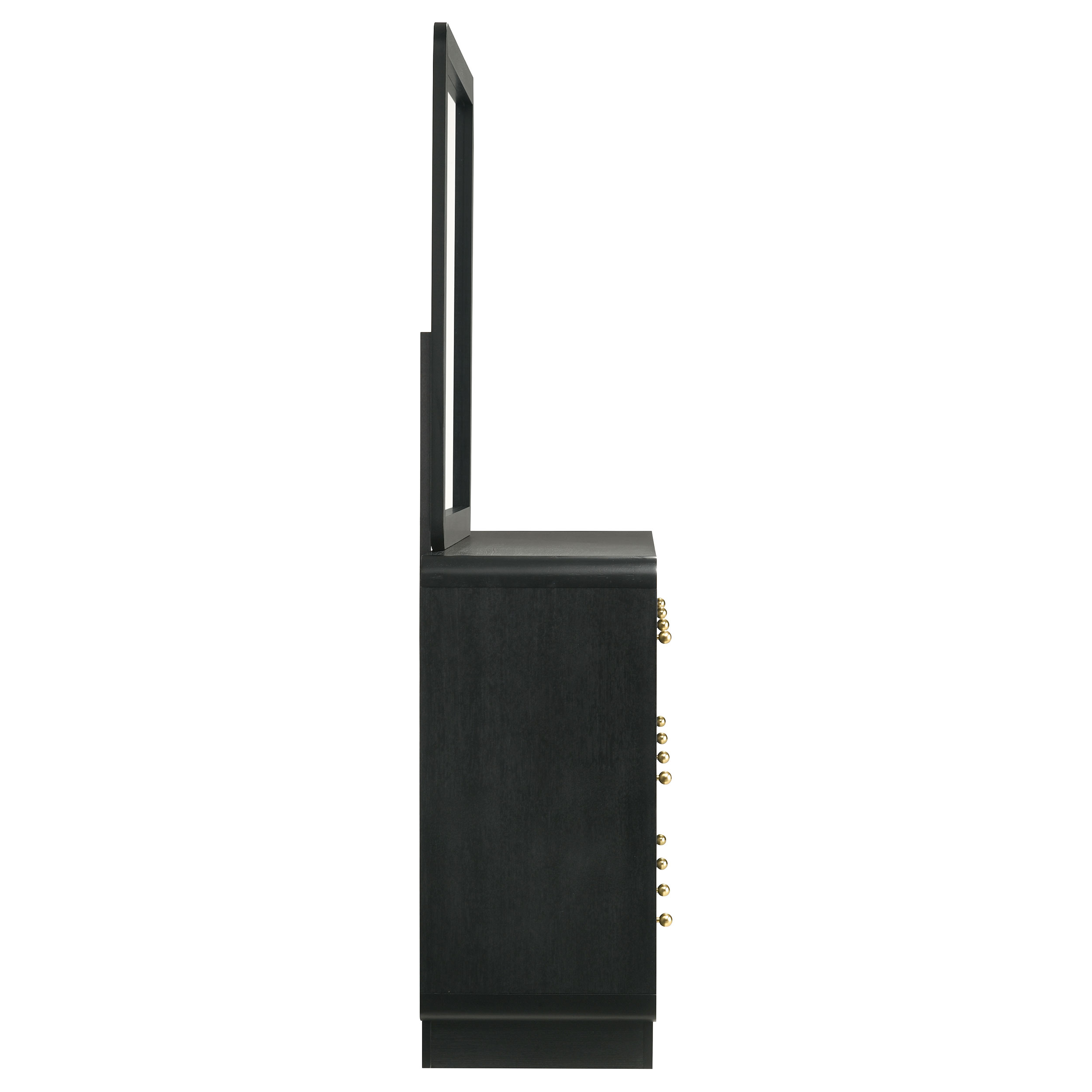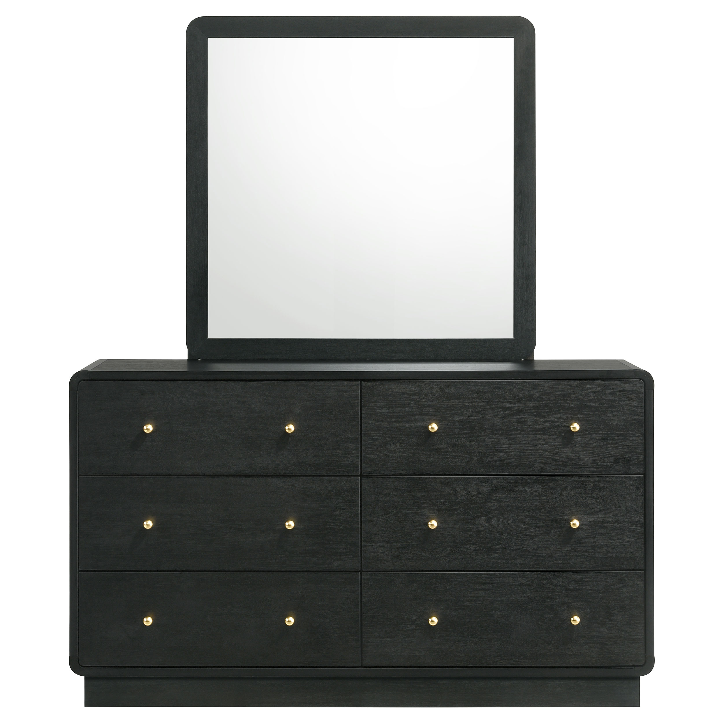 Augment bedroom storage with the plentiful drawer space and stylish presentation of this modern dresser and mirror combination. Its six large drawers facilitate easy organization of clothing and accessories. Each drawer is accentuated with ball knobs in a brass finish, offering warmth and contrast. The dresser and mirror each feature a black finish with rounded corners that soften the bold look and feel. The mirror pairs with a recessed base, each serving to lighten the overall look of this striking dresser.