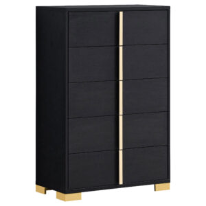 - Six-drawer dresser with bold vertical symmetry and sculptural gold-accented design