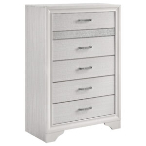 With clean lines and a modern design, this contemporary dresser invites elegant functionality into a master en suite. With six spacious drawers, it provides plenty of space for convenient storage and organization. Its upper drawers are lined with soft felt, protecting your most delicate pieces. A simple, snow white finish and smooth, silver handles add subtle glamour to its sleek silhouette. Constructed from solid wood, this dresser is a durable delight that is sure to enhance any bedroom.