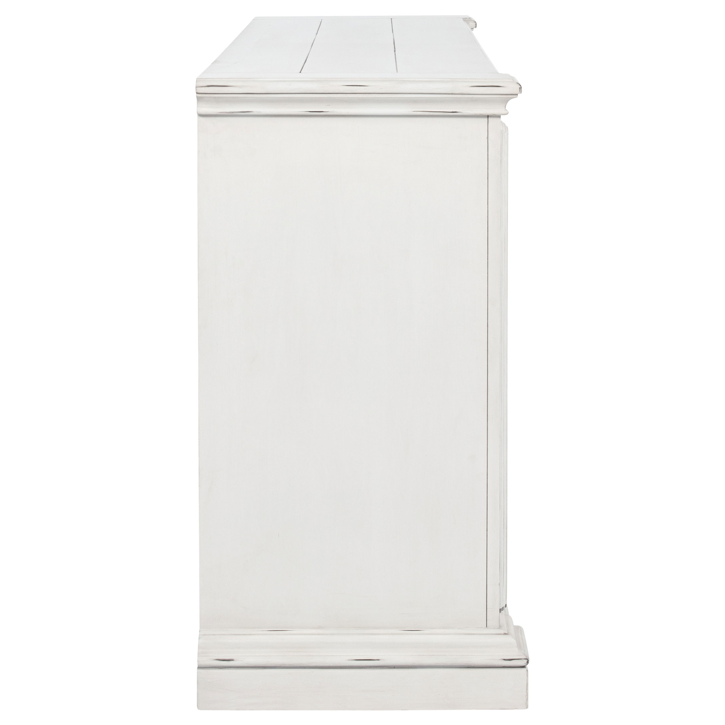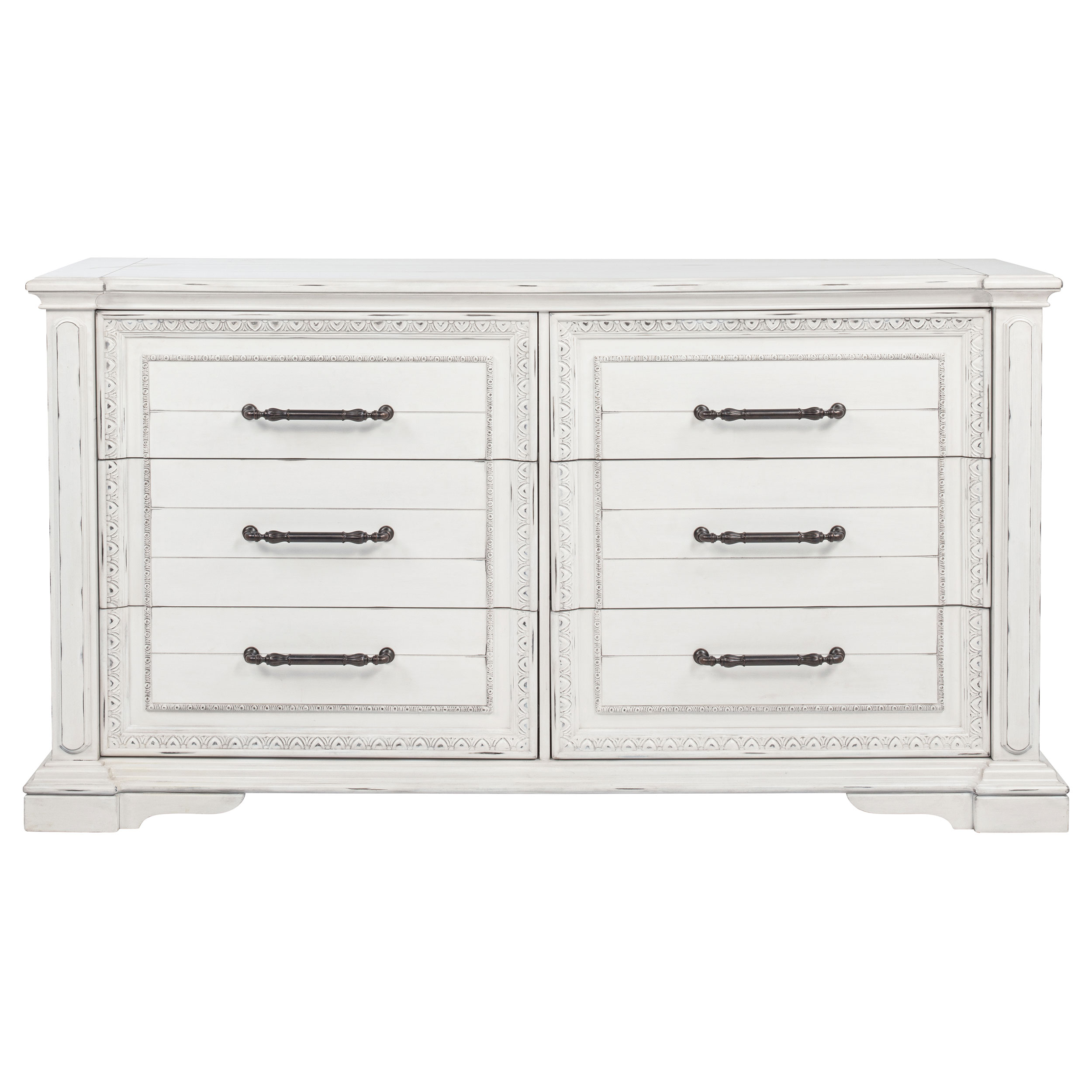 Classic and composed, this six-drawer dresser blends traditional design with elegant practicality. Its vintage white finish is gently distressed, accentuating ornate trim and antique bronze drawer pulls. A hidden jewelry tray tucked into the bottom drawer adds a thoughtful touch, while spacious drawers offer smooth functionality. Crafted from poplar and engineered wood, it brings heritage-inspired charm to any bedroom.
