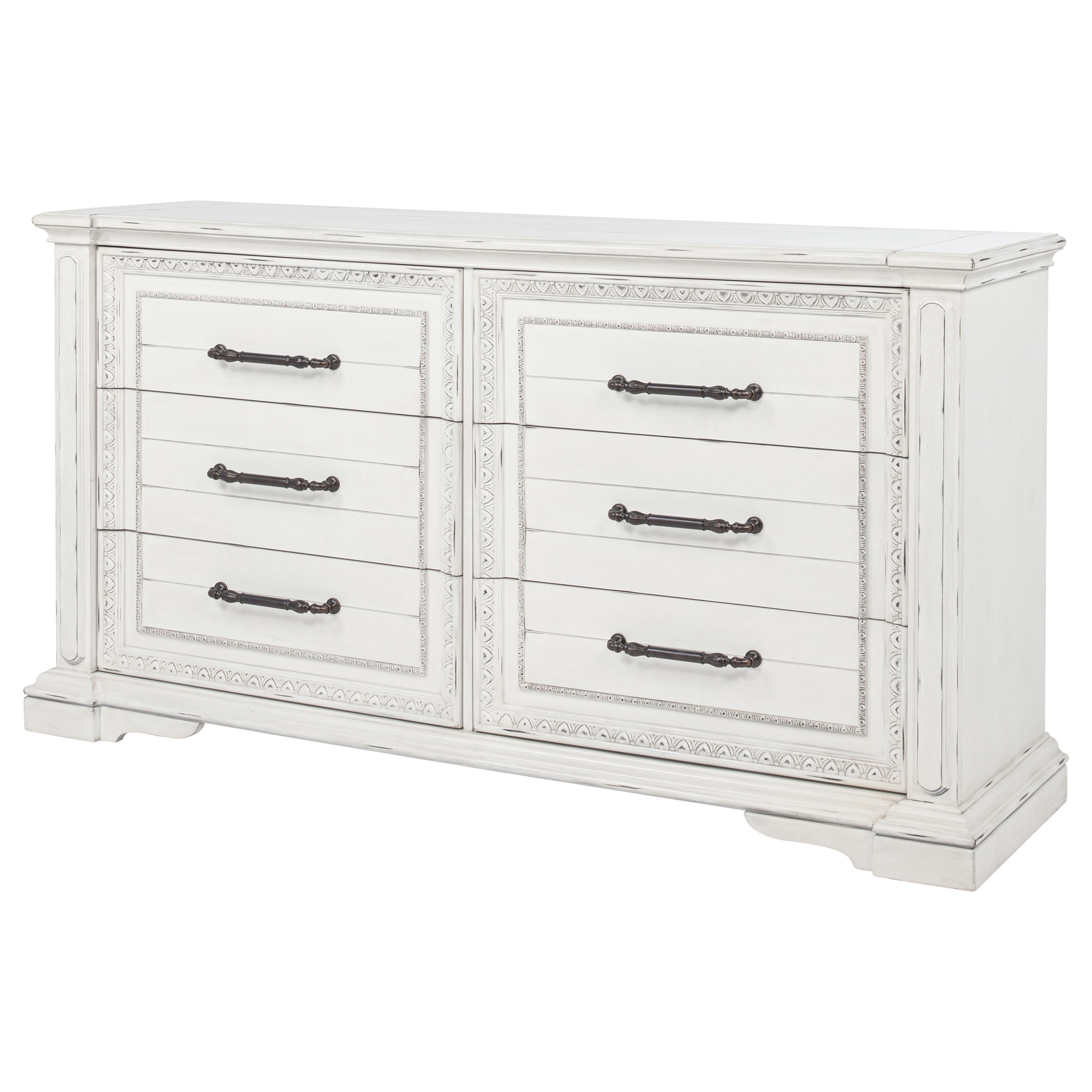 - Six-drawer dresser with traditional molding and carved details for timeless elegance