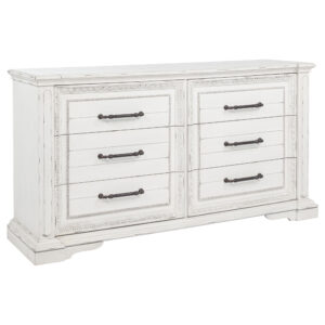 Bring a bedroom together with the rich, rugged design of this handsome, rustic style dresser. A golden brown finish with natural wood grains adds warmth and depth to its design. Eight storage drawers provide plenty of space for clothing and bedroom essentials. Wooden handles top each drawer for added style and ease of use. Pair this rustic dresser with a matching nightstand and chest to instantly amplify your decor.