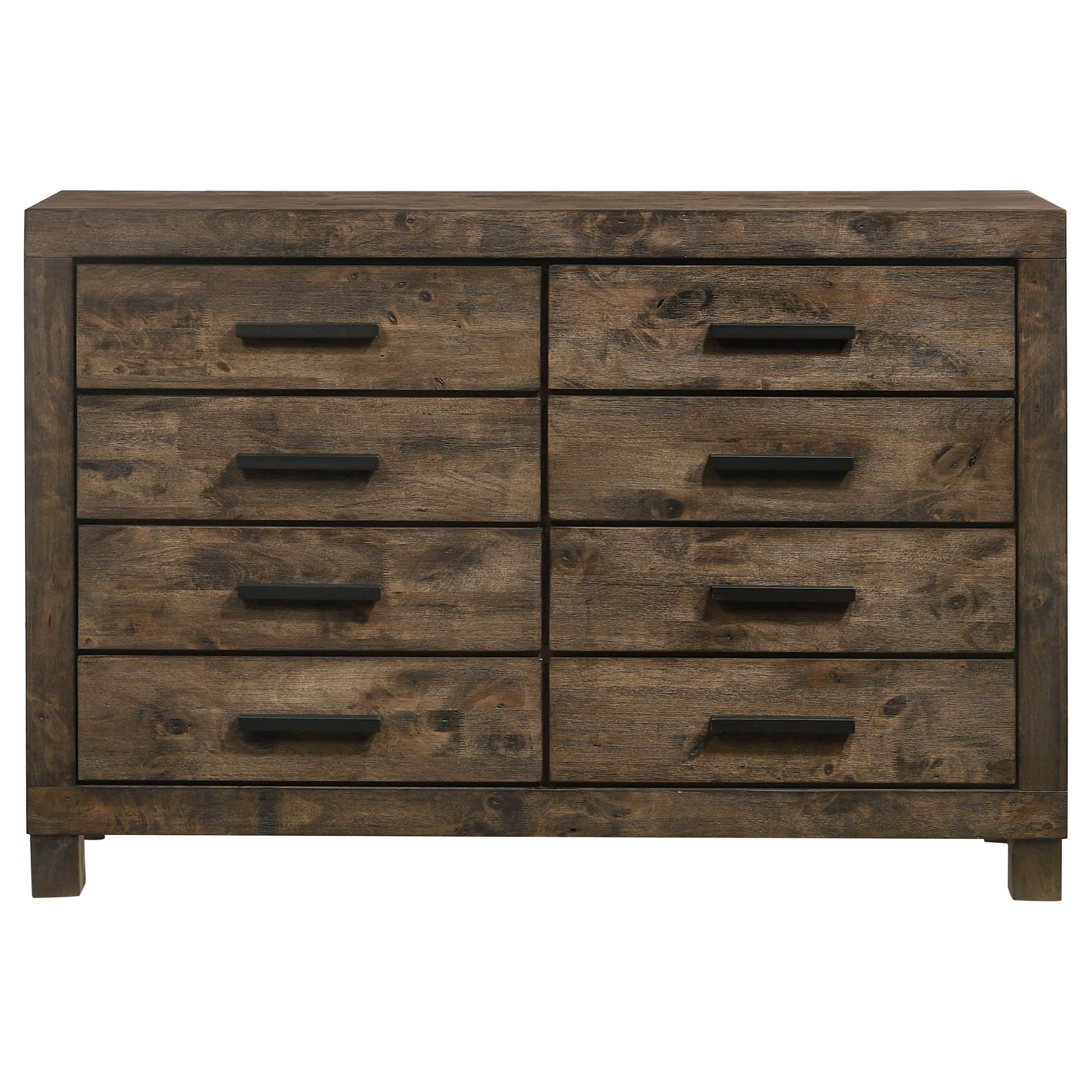 Bring a bedroom together with the rich, rugged design of this handsome, rustic style dresser. A golden brown finish with natural wood grains adds warmth and depth to its design. Eight storage drawers provide plenty of space for clothing and bedroom essentials. Wooden handles top each drawer for added style and ease of use. Pair this rustic dresser with a matching nightstand and chest to instantly amplify your decor.