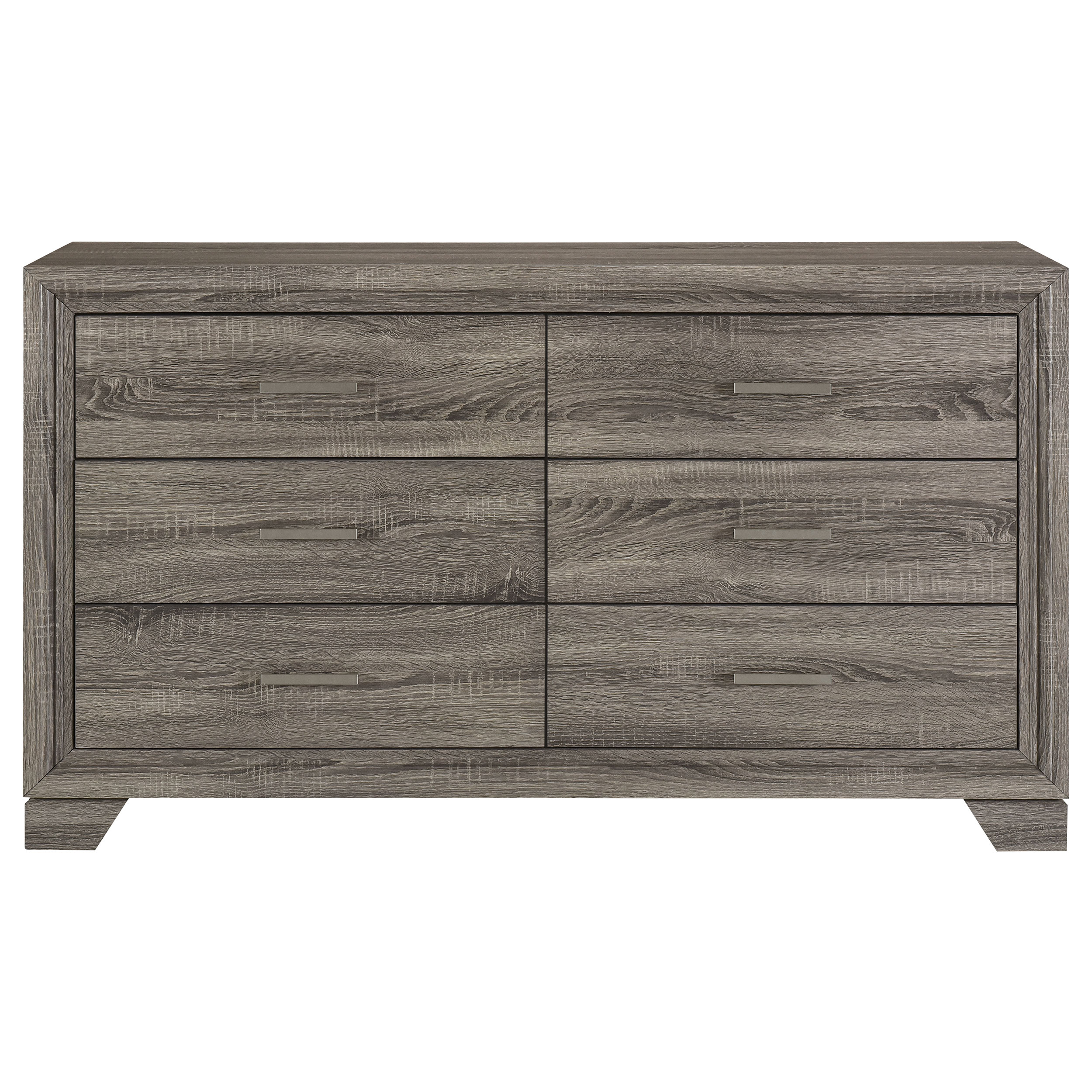 Introduce gracious style in an approachable, tailored bedroom suite with this transitional six-drawer dresser. Designed to augment clothing and accessory storage, it’s built with six roomy drawers, all complete with center metal glides for smooth performance. Its exterior features engineered wood and laminate construction, creating durability and reliability. Its case is encased in mitered trim and stands on singular block legs, adding a sense of precision and character. Bar handles complete the stylish look while its wide top allows for a curated selection of decor brings a personal touch.