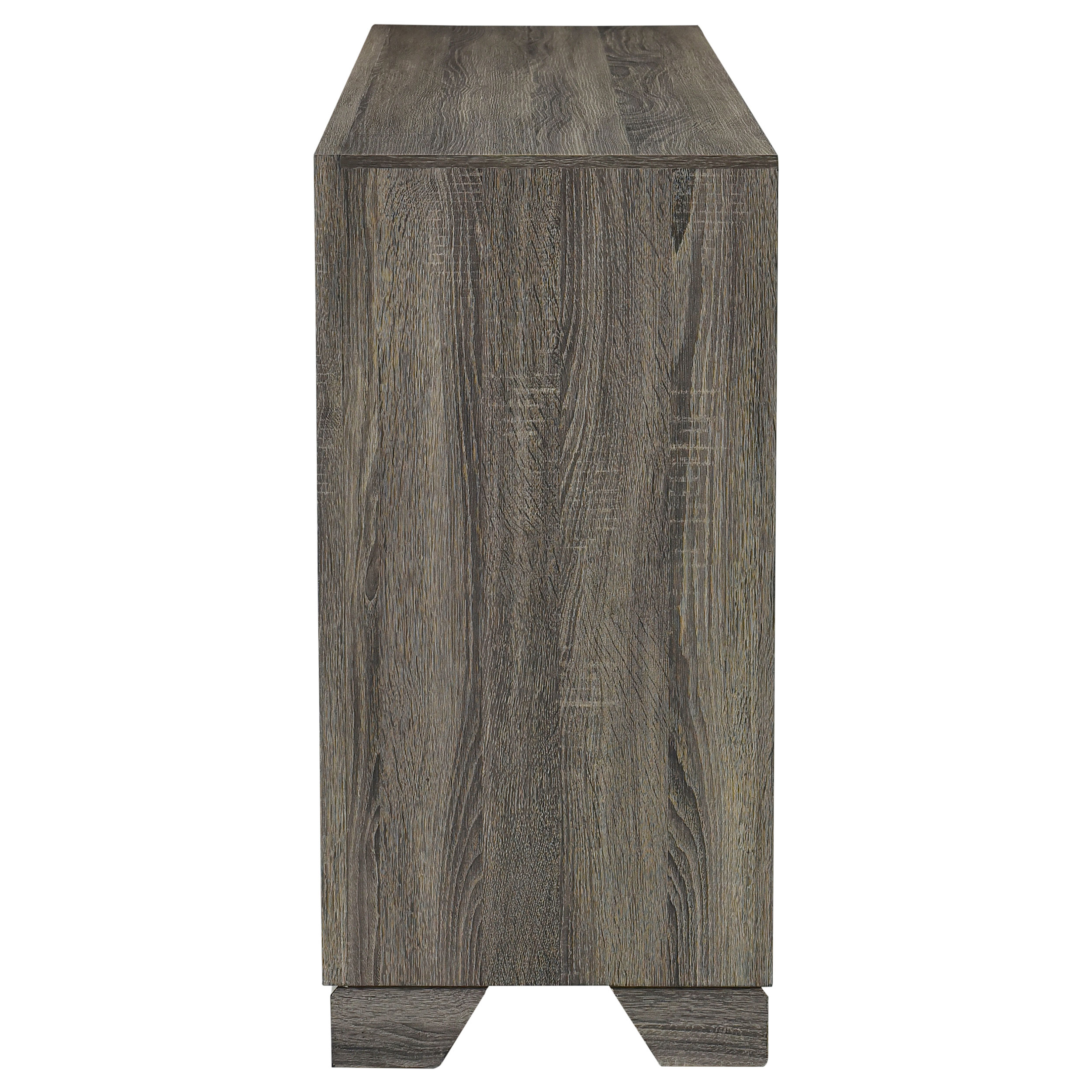 - A brown oak wood grain finish is complemented with metal bar handles that add a touch of contrast