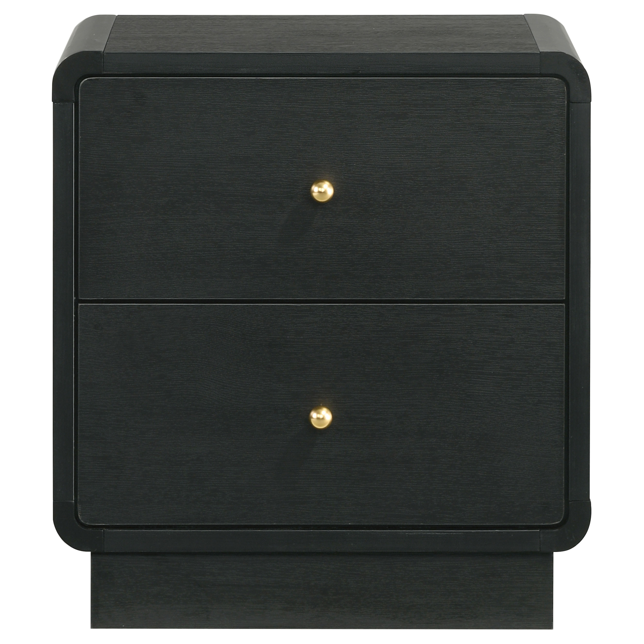 Put finishing touches on a sophisticated bedroom ensemble with this modern two-drawer nightstand. Offering roomy storage for overnight essentials, it features a rich black finish over melamine surfaces that are designed for longevity. The nightstand features a rounded corner case, creating a softened effect in a luxurious space. Drawer fronts are complemented with brass-finished ball knobs, adding the perfect hint of warmth and sophistication. A recessed base completes the look, while metal drawer glides provide for smooth, seamless operation.